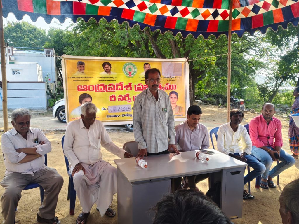 పయనించే సూర్యుడు మేజర్ న్యూస్ డిసెంబర్ 28.12.2025 చిత్తూరు జిల్లా పుంగనూరు నియోజకవర్గం చౌడేపల్లి మండల ప్రతినిధి జె. నాగరాజ) ఆంధ్రప్రదేశ్ ప్రభుత్వం ప్రతిష్టాత్మకంగా చేపట్టిన భూముల రి సర్వే ను అధికారులకు రైతులు సహకరించాలని తెలుగుదేశం పార్టీ యువ నేత మాదిరాజు ప్రదీప్ రాజు అన్నారు శనివారం మండలంలోని పందిళ్ళపల్లి పంచాయతీ బాలసముద్రంలో రి సర్వే పై గ్రామసభ నిర్వహించారు ఈ సందర్భంగా ఆయన ప్రసంగిస్తూ ఇప్పటివరకు గ్రామాలకు సంబంధించిన బౌండరీల రీ సర్వే జరిగిందన్నారు వచ్చే జనవరి 2 నుంచి రైతుల భూములకు సంబంధించిన సర్వే ఉంటుందన్నారు రైతులు తమ రికార్డులను తీసుకొని భూముల రీసర్వే కి వచ్చే అధికారులకు సహకరించాలని కోరారు అనంతరం ప్రభుత్వం చేపట్టిన పలు అభివృద్ధి కార్యక్రమాలను గురించి వివరించారు ఈ కార్యక్రమంలో రెవిన్యూ అధికారులు గ్రామస్తులు పాల్గొన్నారు