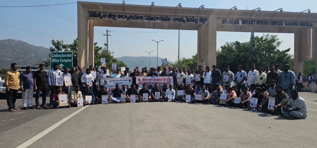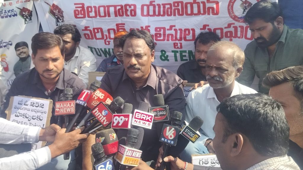 పయనించే సూర్యుడు డిసెంబర్ 28 రాజన్న సిరిసిల్ల జిల్లా ( స్టాఫ్ రిపోర్టర్ ఎమ్ ఎ షకీల్) తెలంగాణ వర్కింగ్ జర్నలిస్టుల అక్రిడిటేషన్ కార్డుల జారి నిమిత్తం రాష్ట్ర ప్రభుత్వం ఇటీవల జారీ చేసిన జీవో నంబర్ 252 జర్నలిస్టుల ప్రయోజనాలకు విఘాతం కలిగించేలా ఉందని తెలంగాణ యూనియన్ ఆఫ్ వర్కింగ్ జర్నలిస్ట్స్ (TUWJ H 143) జిల్లా అధ్యక్షులు లాయక్ పాషా ఆవేదన వ్యక్తం చేశారు. జీవోను నిరసిస్తూ రాష్ట్ర కమిటీ ఇచ్చిన పిలుపుమేరకు శనివారం రాజన్న సిరిసిల్ల జిల్లా కలెక్టరేట్ వద్ద చలో కలెక్టరేట్ ఎదుట భారీ నిరసన కార్యక్రమాన్ని చేపట్టారు. ఈ సందర్భంగా TUWJ జిల్లా అధ్యక్షుడు లాయక్ పాషా మాట్లాడుతూ, ప్రభుత్వం విధించిన కొత్త నిబంధనల వల్ల క్షేత్రస్థాయిలో పనిచేస్తున్న మెజారిటీ జర్నలిస్టులు అక్రెడిటేషన్ కార్డులు పొందే అవకాశాన్ని కోల్పోతారన్నారు. జీవోను రూపొందించిన విధానం జర్నలిస్టుల హక్కులను, సంక్షేమాన్ని కాలరాయడమేనని లాయక్ పాషా మండిపడ్డారు. ప్రత్యేక తెలంగాణ రాష్ట్ర ఉద్యమ సమయంలో జర్నలిస్టులు తమ ప్రాణాలను, ఉద్యోగాలను పణంగా పెట్టి పోరాడారని, తెలంగాణ రాష్ట్ర సాధనలో ముఖ్య భూమికను పోషించిన జర్నలిస్టు సమాజంపై నేడు ప్రభుత్వం కక్ష గట్టడం సమంజసం కాదని వారు పేర్కొన్నారు. ప్రజా పాలన కొనసాగిస్తున్న ముఖ్యమంత్రి రేవంత్ రెడ్డి, మీడియా అకాడమీ చైర్మన్ శ్రీనివాస్ రెడ్డి, రాజన్న సిరిసిల్ల జిల్లాకు ప్రాతినిధ్యం వహిస్తున్న ప్రభుత్వ విప్ ఆది శ్రీనివాస్, ప్రభుత్వ అధికారులు వెంటనే స్పందించి జర్నలిస్టుల సంక్షేమం దృష్ట్యా ఈ జీవోను సవరించాలని ఆయన డిమాండ్ చేశారు. ప్రజా ప్రభుత్వం ఏర్పడి రెండు సంవత్సరాలు దాటినప్పటికీ జర్నలిస్టుల సంక్షేమంపై ప్రభుత్వ కాలయాపన విధానం సరైంది కాదన్నారు. 252 జీవోను సవరించాలి. జర్నలిస్టుల సంక్షేమం కోసం సత్వర చర్యలు తీసుకోని ఎడల యూనియన్ రాష్ట్ర అధ్యక్షులు అల్లం నారాయణ ప్రధాన కార్యదర్శి మారుతి సాగర్ ల నేతృత్వంలో భారీ ఆందోళన కార్యక్రమాలకు కార్యాచరణ రూపొందిస్తామని ఆయన హెచ్చరించారు. అనంతరం జిల్లా కలెక్టరేట్ అధికారికి వినతి పత్రం సమర్పించారు. కార్యక్రమంలో టీయూడబ్ల్యూజే హెచ్ 143 ప్రధాన కార్యదర్శి సామల గట్టు, ఎలక్ట్రానిక్ మీడియా టెన్జూ అధ్యక్షులు ఇరుకుల ప్రవీణ్, ప్రధాన కార్యదర్శి మహమ్మద్ అజీమ్, గౌరవ సలహాదారులు రాపల్లి సంతోష్ లతోపాటు వివిధ మండలాల ప్రెస్ క్లబ్ ల అధ్యక్షులు, కార్యదర్శులు, జిల్లా కార్యవర్గం, యూనియన్ నాయకులు, సుమారు 100కు పైగా జర్నలిస్టులు పాల్గొన్నారు.
