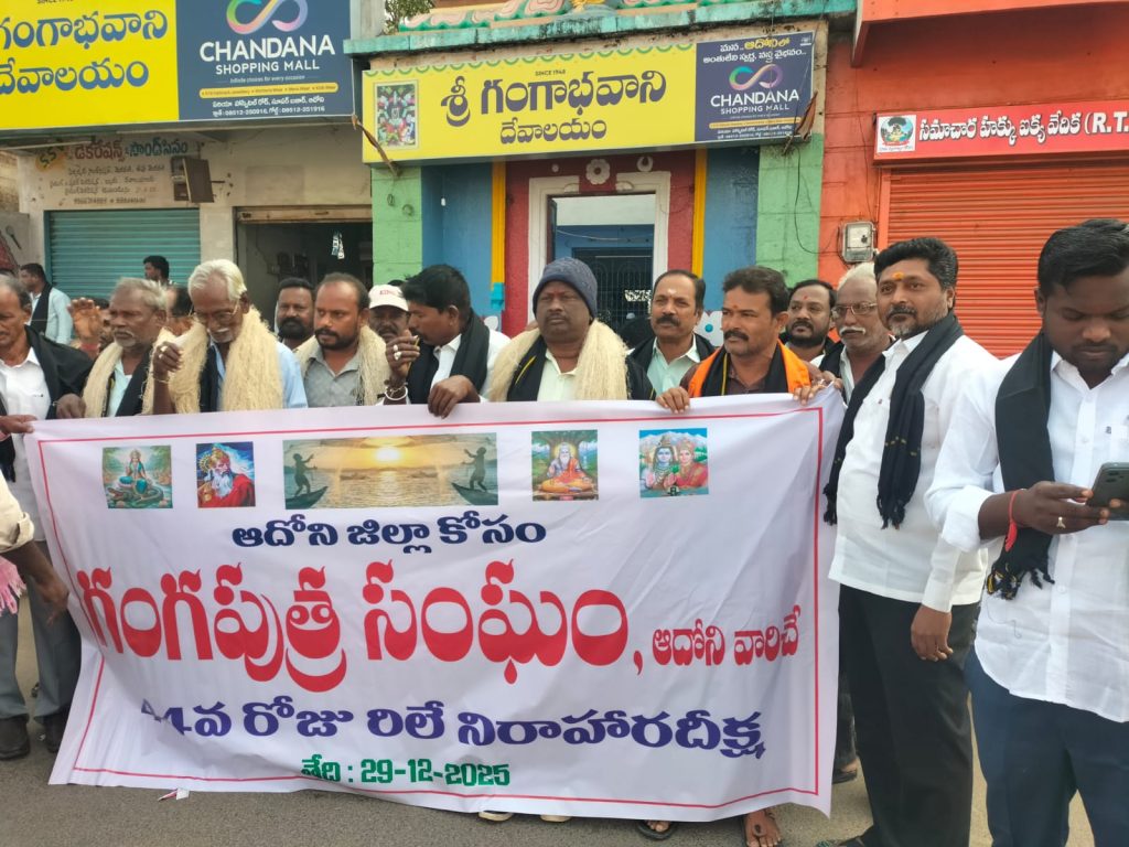 పయనించే సూర్యుడు డిసెంబర్ 30 డివిజన్ ఇంచార్జ్ గుమ్మల బాలస్వామి ఆదోని జిల్లా కావాలని మరి జేఏసీ వారి ఆధ్వర్యంలో ఈ రోజు ఆదోని గంగపుత్ర సంఘం 44 వ రోజున దీక్షలో కూర్చోవడం జరిగింది స్థానిక గంగమ్మ గుడి దేవాలయం నుంచి పాదయాత్ర చేస్తూ భీమా సర్కిల్ వరకు పాదయాత్ర చేస్తూ దీక్షలో కూర్చోవడం జరిగింది ఎమ్మిగనూరు బెస్త గంగపుత్ర సంఘం నాయకులు ఆదోని బెస్త గంగపుత్ర సంఘం వారికి మద్దతు తెలిపారు మరియు ఆలూరు తాలూకా బెస్త గంగ పుత్ర సంఘం అధ్యక్షులు బెస్త గోవిందరాజులు తమ సంపూర్ణ మద్దతు ప్రకటించారు ఆదోని జిల్లా కావాలనీ మా సంఘం తరుపున సంపూర్ణ మద్దతు ప్రకటించారు గంగపుత్రుల దీక్షకు మద్దతుగా పెద్ద హరివనం గ్రామస్తులు పెద్ద ఎత్తున సంఘీభావం తెలపడం జరిగింది కురువ కార్పోరేషన్ రాష్ట్ర చైర్మన్ దేవేంద్ర గంగపుత్ర సంఘం వారికి దీక్షకు సంపూర్ణ మద్దతు పలికారు కార్యక్రమంలో బెస్త కార్పొరేషన్ రాష్ట్ర డైరెక్టర్ రామాంజనేయులు సంపూర్ణ మద్దతు పలికారు అలాగే సామాజిక కార్యకర్త సాయిఫణి సంఘీభావం తెలపడం జరిగింది ఈ కార్యక్రమం సిపిఐ వీరేష్ జై భీమ్ సాయిరాం మరియు ఇతర కుల సంఘాల నాయకులు జిల్లా నాయకులు రాష్ట్ర నాయకులు అందరూ పాల్గొన్నారు