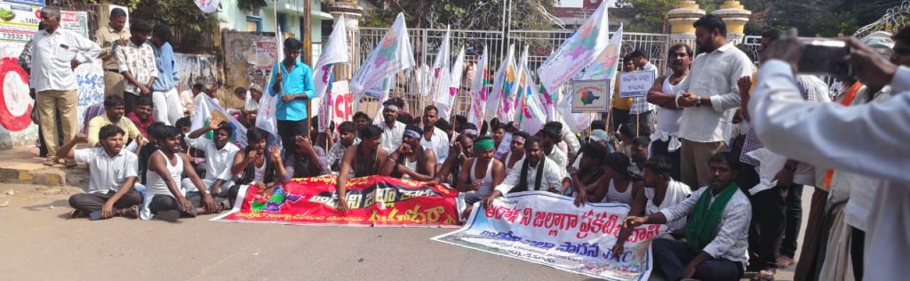 పయనించే సూర్యుడు డిసెంబర్ 30, ఆదోని నియోజకవర్గం క్రైమ్ రిపోర్టర్ కృష్ణ. కర్నూలు నగరంలో ఆదోని జిల్లా సాధన విద్యార్థి జేఏసీ ఆధ్వర్యంలో ధర్నా చౌక్ నుండి విద్యార్థులు భారీ ఎత్తున జై ఆదోని నినాదాలతో, విద్యార్థులు అర్ధనగ్న ప్రదర్శన ర్యాలీగా కర్నూలు కలెక్టరేట్ ప్రాంగణానికి చేరుకున్నారు. అనంతరం విద్యార్థి సంఘాల జేఏసీ నేతలు కలెక్టర్ కి వినతిపత్రాన్ని అందజేయడానికి వెళుతుండగా పోలీసులు అడ్డుకోవడంతో విద్యార్థులు పోలీసులు మధ్య వాగ్వాదం చోటుచేసుకుంది. అనంతరం జిల్లా కలెక్టర్ ని కలిసి ఆదోని జిల్లా ఏర్పాటు చేసి ఈ ప్రాంత అభివృద్ధికి ప్రాధాన్యత ఇవ్వాలని వినతిపత్రాన్ని అందజేశారు.