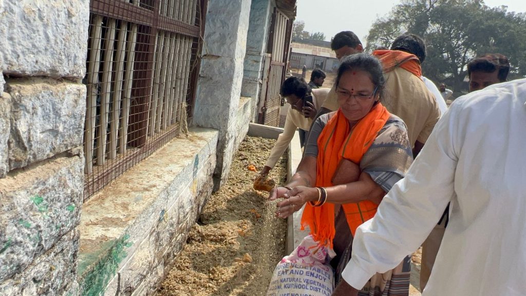 పయనించే సూర్యుడు డిసెంబర్ 31 ఆదోని నియోజకవర్గం క్రైమ్ రిపోర్టర్ కృష్ణ. ఆదోని ఎమ్మెల్యే డాక్టర్ పార్థసారథి జన్మదిన పురస్కరించుకుని ఆదోని భారతీయ జనతా పార్టీ ఆధ్వర్యంలో గోమాతలకు దానా దానాన్ని చేయడం జరిగింది. ఈ సందర్భంగా బిజెపి నాయకులు మాట్లాడుతూ ఆదోనిలో ఎవరి జన్మదినం ఉన్న సేవా కార్యక్రమాలు చేయాలనుకునే వారికి గో సేవా చెయ్యాలని పిలుపునిచ్చారు. గోమాతకు సేవ చేయడం ద్వారా మనకు మానసికంగా, మన కుటుంబానికి చాలా మంచి జరుగుతుందని బిజెపి నాయకులు తెలిపారు. కార్యక్రమంలో గోశాల నిర్వాహకులు దేవరాజ్ ధోకా దీపక్ ధోకా బిజెపి నాయకులు దేశాయ్ చంద్రన్న, కునిగిరి నీలకంఠ, ఉపేంద్రకుమార్, నాగరాజు గౌడ్ , కౌన్సిలర్ల లితమ్మ, సురేష్, తాయప్ప వాల్మీకి, మధుసూదన్ శర్మ, సాయి ప్రసాద్ వాల్మీకి, చంద్ర, వేణుగోపాల్, మహదేవ్, కాశీ, కిరణ్, ఉషా రాజ్ తదితరులు పాల్గొన్నారు.