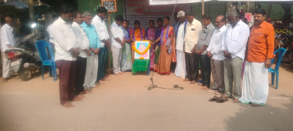 పయనించే సూర్యుడు జనవరి 04 కర్నూలు జిల్లా ఇంచార్జ్ శ్రీకాంత్ ఎమ్మిగనూరు లోనే వైఎస్ఆర్ సర్కిల్లో ఆదోని జిల్లా సాధనకై జేఏసీ ఆధ్వర్యంలో చేపట్టిన రిలే నిరాహార దీక్షలు 26వ రోజుకు చేరుకున్నాయి దీక్షకు సంఘీభావంగా మాల మహానాడు మహిళా నాయకులు శాంతమ్మ పార్వతమ్మ లక్ష్మమ్మ ఉరుకుందమ్మా లక్ష్మి సావిత్రి దీక్షలో కూర్చోవడం జరిగింది ఈ సందర్భంగా వారు సావిత్రిబాయి పూలే జయంతి సందర్భంగా నివాళులు అర్పించిన అనంతరం దీక్షను కొనసాగించడం జరిగింది ఈ సందర్భంగా మహిళలు మాట్లాడుతూ కరువు వలసలకు విలువైన పశ్చిమ ప్రాంత మహిళ అభివృద్ధి సాధికారత జరగాలంటే అది కేవలం ఆదోని జిల్లా తోనే సాధ్యం అని వారు ఉద్ఘటించారు ఆదోని జిల్లా ఈ ఏర్పడితేనే మహిళల అక్షరాస్యత శాతం పెరిగి బాల్యవివాహాలు సైతం తగ్గి ముఖ్యంగా గ్రామీణ మహిళలకు సుగ్గి భారం తగ్గుతుందని వారు ఆశాభావం వ్యక్తం చేశారు కనుక కూటమి ప్రభుత్వం స్పందించి వెంటనే ఆదోనిని జిల్లా చేయాలని వారు ప్రభుత్వాన్ని డిమాండ్ చేశారు ఈ కార్యక్రమంలో జేఏసీ నాయకులు గణేష్ ఉదయ్ ఖాజా కృష్ణ అఫ్రిది రఘు బతకన్నా సత్యన్నా ప్రసాద్ సత్యనారాయణ రెడ్డి ఇతర జేఏసీ నాయకులు పాల్గొన్నారు.