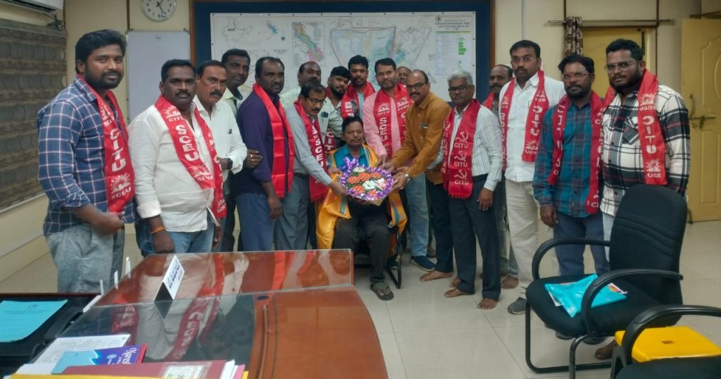 పయనించే సూర్యుడు న్యూస్: పెద్దపల్లి జిల్లా, సెంటినరీ కాలనీ జనవరి-11 :- రామగుండం-3 నూతన జెనరల్ మేనేజర్ గా పదవి బాధ్యతలు స్వీకరించిన సుంకర మధుసూదన్ ని (సిఐటియు) అద్వర్యములో నాయకులు ఘనంగా సన్మానించారు. అర్జీ త్రీ సిఐటియు డివిజన్ కమిటీని జిఎం కి పరిచయం చేసుకున్నారు. ఈ కార్యక్రమంలో డివిజన్ అధ్యక్ష, కార్యదర్శులు శ్రీనివాస్, దొమ్మటి కొమురయ్య నాయకులు కుమార్, వెంకటేశ్వర్లు, వేణుగోపాల్, హామేద్ పాషా, సదానందం, రవికుమార్, రాజేష్ ఆసారి మహేష్, ధర్మ రాజు, రాజేష్, రమణారెడ్డి, ప్రవీణ్, హాబీబ్ పాషా, రాయమల్లు, వెంకటేష్, రాజేందర్, రాజేశం తదితరులు పాల్గొన్నారు.