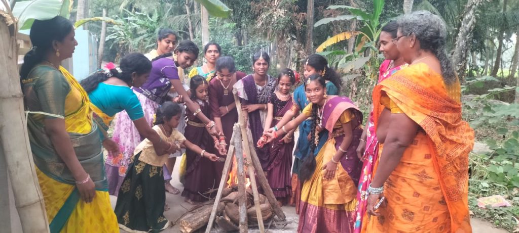 పయ నించే సూర్యుడు జనవరి 13 ముమ్మిడివరం ప్రతినిధి ముమ్మిడివరం మండలం ఠాణేలంక బాడవ గ్రామంలో సమరసత సేవా ఫౌండేషన్ ధార్మిక సమితి సభ్యులు లక్ష్మణరావు ఆధ్వర్యంలో సంక్రాంతి సంబరాలు నిర్వహించడం జరిగింది ఈ కార్యక్రమంలో ముఖ్య అతిథిగా విచ్చేసిన గొలకోటి వెంకటరెడ్డి జ్యోతి ప్రజ్వలన చేసి కార్యక్రమం ప్రారంభించినారు ముందుగా భరతమాత పూజ స్వామి వివేకానంద జయంతి నిర్వహించి వివేకానందుని యొక్క మార్గంలో యువత పయనించాలని సూచించారు చిన్న పిల్లలకు ముందుగా భోగి పళ్ళు పోసి ముగ్గుల పోటీలు నిర్వహించి బహుమతులు అందించడం జరిగినది సంక్రాంతి అంటే పిండి వంటలు అటువంటి పిండి వంటలను సాంప్రదాయబద్ధంగా రోటిలో బియ్యము దంచి పిండి తయారు చేసి కట్టెల పొయ్యిపై పిండి వంటలు చేయడం జరిగినది పాలు పొంగించి పొంగలి తయారుచేసి అందరికీ పంచడం జరిగినది. భోగిమంట వెలిగించి బోగి పిడకలు వేసి చిన్నారుల సందడి చేయడం జరిగింది. ఎస్ఎస్ఎఫ్ ధర్మ ప్రచారక్ మాట్లాడుతూ ఇటువంటి కార్యక్రమాలు నిర్వహించడం వలన మరిచిపోతున్న మన ఆచారాలు సాంప్రదాయాలు చిన్నారులకు తెలుస్తాయి అన్నారు మనందరం మన ధర్మాన్ని కాపాడుకోవడంలో ప్రతి ఒక్కరు కృషి చేయాలని అన్నారు ఈ కార్యక్రమంలో గ్రంధి నానాజీ సుంకర నాగేశ్వరరావు మొల్లేటి లక్ష్మణరావు బొక్కా నాగేశ్వరి రాయుడు రాజేశ్వరి దంగేటి నాగమణి రాయుడు చంద్రావతి మొల్లేటి కనకదుర్గ దంగేటి ఈశ్వరి కొనే రామ్మూర్తి గాలిదేవర రమేష్ మొల్లేటి తులసి దంగేటి అర్జువేని దంగేటి స్వర్ణలత గ్రామస్తులు మాతృమూర్తులు పాల్గొన్నారు