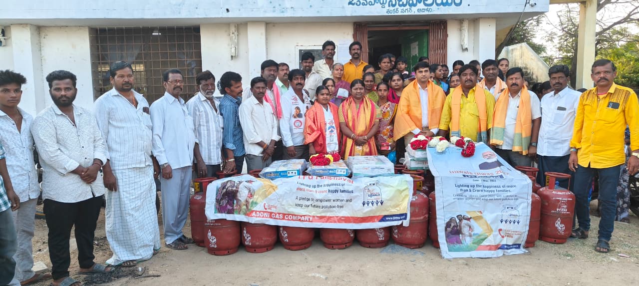 పయనించే సూర్యుడు జనవరి 15 ఆదోని నియోజకవర్గం ప్రతినిది బాలకృష్ణ ఆదోని కల్లుబావి శంకర్ నగర్ 23వ వార్డు నందు ప్రధానమంత్రి నరేంద్ర మోడీ ప్రవేశపెట్టిన. ప్రధానమంత్రి ఉజ్వల యోజన పథకం కింద దాదాపు 30 ఉచిత గ్యాస్ సిలిండర్లనుకర్నూలు జిల్లా టిడిపి అధ్యక్షురాలు శ్రీమతి గుడిసె ఆది కృష్ణమ్మ అలాగే హెచ్.పీ గ్యాస్ డీలర్ రంగనాథ్ టిడిపి లీడర్ మల్లికార్జున .ఆధ్వర్యంలో పంపిణీ చేయడం జరిగినది. ఈ కార్యక్రమంలో వార్డు టిడిపి నాయకులు కార్యకర్తలు గుడిసె శ్రీరాములు మురళి శాదిక్ వలి బాబురావు భరత్ వెంకటనారాయణ లక్ష్మినారాయణ నాగరాజ్ తదితరులు పాల్గొన్నారు. అలాగే లబ్ధిదారులు కృతజ్ఞతలు తెలియజేశారు.