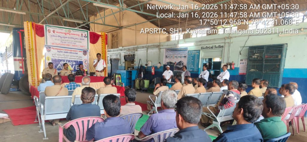 గజ్వేల్ ప్రజ్ఞాపూర్ ఆర్టీసీ బస్ డిపో డ్రైవర్స్ కి ఆర్ వి అలవి రోడ్ సేఫ్టీ ప్రోగ్రాంలో భాగంగా గజ్వేల్ ఏసిపి నరసింహులు, గజ్వేల్ ట్రాఫిక్ ఇన్స్పెక్టర్ మురళి, గజ్వేల్ ఇన్స్పెక్టర్ రవికుమార్,. కలిసి ఆర్టీసీ డ్రైవర్లకు రోడ్డు భద్రత ట్రాఫిక్ రూల్స్, డ్రైవింగ్ చేసేటప్పుడు తీసుకోవాల్సిన జాగ్రత్తలు అవగాహన కల్పించారూ ముఖ్యంగా ఆర్టీసీ డ్రైవర్లు రోడ్డు నిబంధనలు ట్రాఫిక్ నిబంధనలు పాటించి పార్కింగ్ ప్రదేశాల్లో మాత్రమే బస్సులను పార్కు చేయాలని సూచించారు. ట్రాఫిక్ నిబంధనలు రోడ్డు నిబంధనలు పాటిస్తూ వాహనాలు నడుపుతూ రోడ్డు ప్రమాదాల నివారణకు కృషి చేయాలని తెలిపారు. రోడ్డు ప్రమాదాల నివారణ.కృషి చేస్తామనిఆర్ టీ సి సిబ్బంది ప్రతిజ్ఞ చేశారు ఈ కార్యక్రమంలో డిపో మేనేజర్ పవన్ కుమార్, డిపో సిఐ బాబు,. ఆర్టీసీ డిపో డ్రైవర్లు మెకానికులు తదితరులు పాల్గొన్నారు.