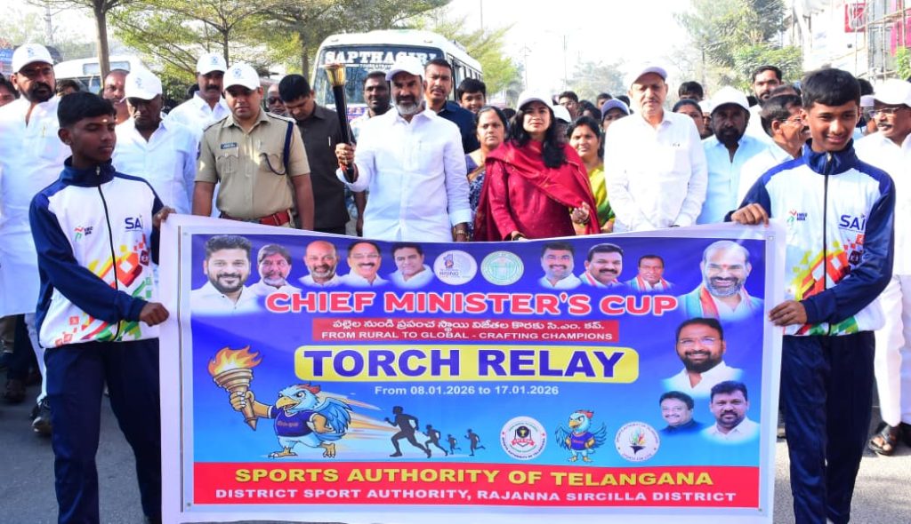 పయనించే సూర్యుడు న్యూస్ జనవరి 18 రాజన్న సిరిసిల్ల జిల్లా (స్టాఫ్ రిపోర్టర్ ఎమ్.ఎ. షకీల్ ) విద్యార్థి దశ నుంచే క్రీడలకు సీఎం రేవంత్ రెడ్డి నేతృత్వంలోని ప్రజా ప్రభుత్వం ప్రోత్సాహం అందిస్తుందని ప్రభుత్వ విప్, వేములవాడ ఎమ్మెల్యే ఆది శ్రీనివాస్ తెలిపారు. సీఎం కప్ పోటీల ప్రారంభం సందర్భంగా రాజన్న సిరిసిల్ల జిల్లా కేంద్రంలో జిల్లా యువజన, క్రీడల శాఖ ఆధ్వర్యంలో శనివారం సీఎం కప్ టార్చ్ ర్యాలీని ప్రభుత్వ విప్, వేములవాడ ఎమ్మెల్యే ఆది శ్రీనివాస్, ఇంచార్జి కలెక్టర్ గరిమ అగ్రవాల్, ఎస్పీ మహేష్ బి గితే తో కలిసి ప్రారంభించారు. అంబేద్కర్ చౌక్ నుంచి నేతన్న విగ్రహం వరకు విప్, ఇంచార్జి కలెక్టర్, ఎస్పీ, అధికారులు, క్రీడాకారులు, విద్యార్థులతో కలిసి ర్యాలీ తీశారు. ఈ సందర్భంగా ప్రభుత్వ విప్, వేములవాడ ఎమ్మెల్యే ఆది శ్రీనివాస్ మాట్లాడుతూ.. ఒలింపిక్స్ లో దేశం నుంచి ఎక్కువ సంఖ్యలో పతకాలు సాధించాలనే ఉద్దేశ్యంతో ప్రజా ప్రభుత్వం ప్రణాళిక ప్రకారం ముందుకు వెళ్తుందని తెలిపారు. సీఎం కప్ పేరిట రాష్ట్రంలోని గ్రామ స్థాయి నుంచి ప్రతిభ ఉన్న క్రీడాకారులను వెలికి తీసి జాతీయ స్థాయి, అంతర్జాతీయ స్థాయి పోటీల్లో రాణించేలా ప్రోత్సాహం అందిస్తుందని తెలిపారు. వివిధ క్రీడ విభాగాల్లో రాష్ట్రంలోని అన్ని గ్రామాల నుంచి షెడ్యూల్ ప్రకారం పోటీలు నిర్వహిస్తుందని వివరించారు. క్రీడాకారులకు అన్ని సౌకర్యాలు, శిక్షణ అందిస్తుందని తెలిపారు. నిరుద్యోగ యువతకు ఉద్యోగాలు ఇస్తుందని, యువత, విద్యార్థులకు ఉత్తమ శిక్షణ, ఉపాధి కల్పించే అడ్వాన్స్డ్ టెక్నాలజీ సెంటర్లను ప్రభుత్వం ఏర్పాటు చేస్తుందని వెల్లడించారు. సీఎం కప్ పోటీలు నిర్వహిస్తున్న ముఖ్య మంత్రి రేవంత్ రెడ్డి, క్రీడల శాఖ మంత్రి వాకిటి శ్రీహరికి కృతజ్ఞతలు తెలియజేశారు. రాష్ట్రస్థాయిలో ఎక్కువ పతకాలు సాధించాలి జిల్లాలోని విద్యార్థులు, యువత సీఎం కప్ పోటీల్లో పాల్గొని ఎక్కువ సంఖ్యలో పతకాలు సాధించాలని ఇంచార్జి కలెక్టర్ గరిమ అగ్రవాల్ ఆకాంక్షించారు. సీఎం కప్ పోటీల ప్రారంభోత్సవం సందర్భంగా ఇంచార్జి కలెక్టర్ మాట్లాడారు. విద్యార్థులు, యువత మొబైల్ ఫోన్లు తక్కువ ఉపయోగించాలని, క్రీడలు, మైదానాల్లో ఎక్కువ సమయం గడపాలని సూచించారు. క్రీడల్లో పాల్గొనడంతో శారీరక దారుఢ్యం, పాజిటివ్ ఎనర్జీ పెరుగుతుందని తెలిపారు. సీఎం కప్ టార్చ్ ర్యాలీ సిరిసిల్లలో మొదలై జిల్లాలోని అన్ని మండలాల్లో సాయంత్రం వరకు పూర్తి అవుతుందని తెలిపారు. జిల్లా నుంచి విద్యార్థులు, యువత క్రీడల్లో రాణించేలా జిల్లా క్రీడల, విద్యా శాఖ ఆధ్వర్యంలో శిక్షణ అందిస్తామని వివరించారు. రాష్ట్ర ప్రభుత్వ షెడ్యూల్ ప్రకారం జిల్లాలో మొత్తం 34 విభాగాల్లో పోటీలు నిర్వహిస్