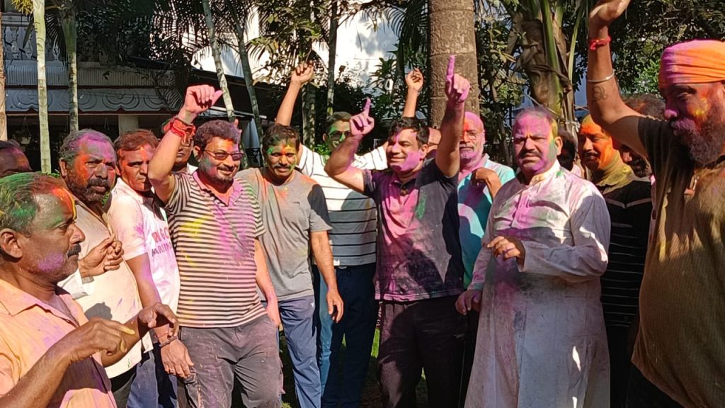పయనించే సూర్యుడు మార్చి 5 కరీంనగర్ న్యూస్: కరీంనగర్ జిల్లా టీఎన్జీవోల సంఘం ఆధ్వర్యంలో హోలీ సంబరాలు ఉత్సాహభరిత వాతావరణంలో ఘనంగా నిర్వహించబడ్డాయి జిల్లా టీఎన్జీవోల అధ్యక్షుడు ఎంప్లాయిస్ జేఏసీ చైర్మన్ దారం శ్రీనివాస్ రెడ్డి ఆధ్వర్యంలో జరిగిన ఈ వేడుకలు అంబరాన్నంటాయి. ఈ కార్యక్రమానికి రాష్ట్ర జేఏసీ చైర్మన్ మారం జగదీశ్వర్ ముఖ్య అతిథిగా హాజరై ఉద్యోగులతో కలిసి రంగులు చల్లుకుంటూ నృత్యాలు చేస్తూ వేడుకల్లో పాల్గొన్నారు ఉద్యోగుల్లో ఉత్సాహాన్ని నింపుతూ అందరికీ హోలీ శుభాకాంక్షలు తెలియజేశారు ఈ సందర్భంగా రాష్ట్ర జేఏసీ చైర్మన్ మారం జగదీశ్వర్ జిల్లా జేఏసీ చైర్మన్ దారం శ్రీనివాస్ రెడ్డి జిల్లా కార్యదర్శి సంగెం లక్ష్మణరావు తదితరులు కలిసి మున్సిపల్ కమిషనర్ ప్రపుల్ దేశాయ్ నివాసానికి వెళ్లి వారికి రంగులు పూసి హోలీ శుభాకాంక్షలు తెలియజేశారు కమిషనర్ కూడా ఉద్యోగులతో కలిసి హోలీ సంబరాల్లో పాల్గొని రంగులు చల్లుకుంటూ ఆనందాన్ని పంచుకున్నారు. హోలీ పండుగ చిన్నా–పెద్ద తారతమ్యం లేకుండా అందరూ కలసి ఆనందంగా జరుపుకునే పండుగ అని నాయకులు పేర్కొన్నారు. చెడుపై మంచి సాధించిన విజయానికి ప్రతీకగా శీతాకాలానికి ముగింపు పలుకుతూ వసంత ఋతువుకు స్వాగతం పలికే పండుగగా హోలీని భావిస్తామని తెలిపారు డప్పు చప్పుల మధ్య జరిగిన ఈ రంగుల హోలీ సంబరాలు ఉద్యోగుల మధ్య ఐక్యతను, స్నేహభావాన్ని మరింత బలోపేతం చేశాయి ఈ కార్యక్రమంలో టిఎన్జీవోల సంఘం జిల్లా అధ్యక్షుడు దారం శ్రీనివాస్ రెడ్డి కార్యదర్శి సంగేం లక్ష్మణరావు అసోసియేట్ అధ్యక్షులు ఒంటెల రవీందర్ రెడ్డి జిల్లా కోశాధికారి ముప్పిడి కిరణ్ కుమార్ రాష్ట్ర నాయకులు గూడ ప్రభాకర్ రెడ్డి రాగి శ్రీనివాస్ సర్దార్ హర్మీందర్ సింగ్ పట్టణ సంఘం అధ్యక్షులు మారుపాక రాజేష్ భరద్వాజ్ కార్యదర్శి వెలిచాల సుమంతరావు రూరల్ అధ్యక్షులు కోడూరి వాస్తవిక్ గౌడ్ కార్యదర్శి కొమ్మేర శ్రీనివాస్ రెడ్డి తిమ్మాపూర్ అధ్యక్షులు పోలు కిషన్ నాయకులు కోట రామస్వామి శంకర్ రమేష్ గౌడ్ ప్రసాద్ రెడ్డి ఎవి .రాజేశ్వరరావు నగేష్ గౌడ్ బైరి శ్రీనివాస్ కోటేశ్వర అల్లే శ్రీనివాస్తదితరులు పాల్గొన్నారు