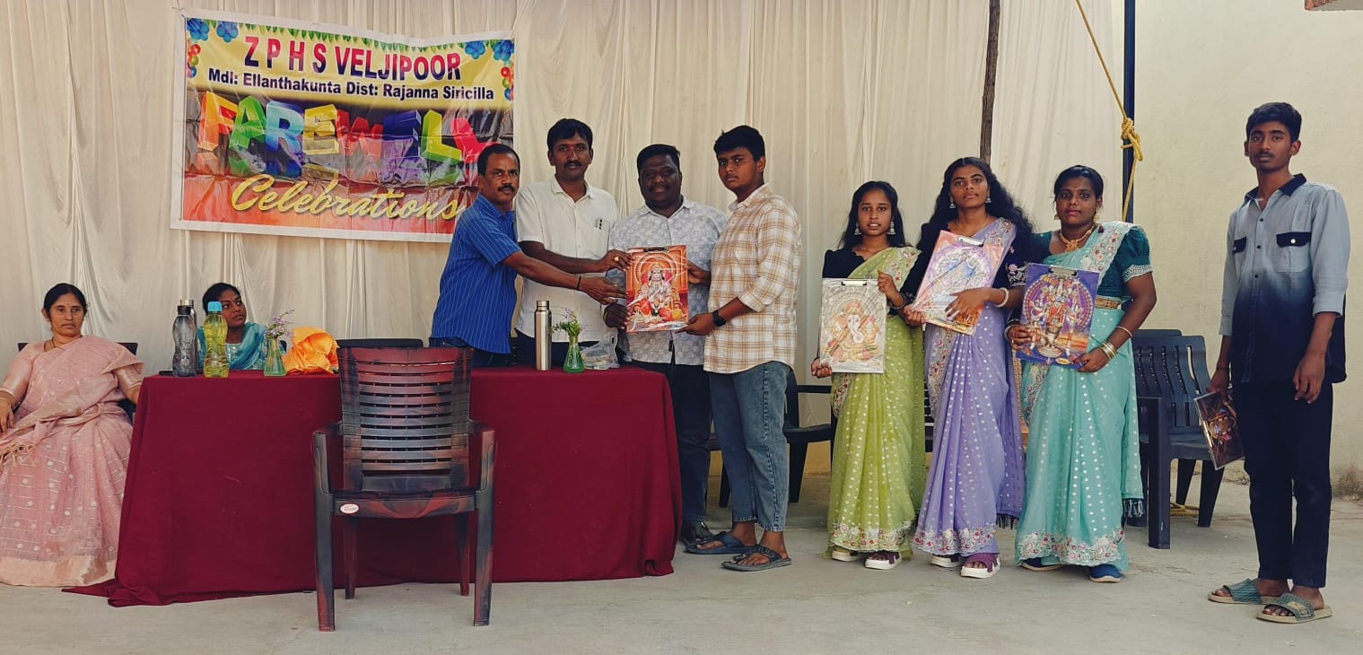 పయనించే సూర్యుడు న్యూస్ మార్చి /010 :నియోజకవర్గం స్టఫ్ రిపోర్టార్ :సాయిరెడ్డి బొల్లం :రాజన్న సిరిసిల్ల జిల్లా మాన కొండూర్ నియోజకవర్గం ఇల్లంతకుంట మండలం వెల్జీపురం గ్రామంలోని జిల్లా పరిషత్ ఉన్నత పాఠశాలలో పదవ తరగతి చదువుతున్న విద్యార్థుల వీడ్కోలు సమావేశం ఈరోజు ఘనంగా నిర్వహించారు. ఈ సందర్భంగా కార్యక్రమంలో పాల్గొన్న వారు మాట్లాడుతూ విద్యార్థులు పదవ తరగతిలో మంచి ఉత్తీర్ణత సాధించి తల్లిదండ్రులకు, ఉపాధ్యాయులకు మరియు గ్రామానికి మంచి పేరు తీసుకురావాలని, భవిష్యత్తులో ఉన్నత స్థానాలకు ఎదగాలని ఆకాంక్షించారు. ఈ సందర్భంగా కీ.శే. బొల్లారం బాలయ్య, జ్ఞాపకార్థం బొల్లారం బ్రదర్స్ ఆధ్వర్యంలో పదవ తరగతి విద్యార్థులకు ఉచితంగా రైటింగ్ ప్యాడ్లు పంపిణీ చేశారు. అలాగే విద్యార్థుల కోరిక మేరకు వీడ్కోలు కార్యక్రమానికి అవసరమైన టెంట్లు మరియు సౌండ్ సిస్టమ్ను శ్రీరామ ఈవెంట్స్ వారు సమకూర్చారు. అదేవిధంగా ఇటీవల పాఠశాల ఎ ఎ పి సి కమిటీ చైర్మన్గా నూతనంగా నియమితులైన వోరెం రూపశ్రీ భార్గవ్ రెడ్డి పాఠశాల ఉపాధ్యాయులు సత్కరించారు. ఈ కార్యక్రమంలో పాఠశాల ప్రధానోపాధ్యాయులు స్వామిరెడ్డి, పాఠశాల కమిటీ చైర్మన్ ఓరెం రూపశ్రీ, గ్రామ సర్పంచ్ నాయిని నవీన్ కుమార్, ఉపాధ్యాయులు హరికృష్ణ రెడ్డి, కుమారస్వామి, శ్రీనివాస్, రాజిరెడ్డి, అనురాధ, అన్నపూర్ణ, అరుణ, వార్డు సభ్యులు బొల్లారం ప్రసన్నకుమార్, విద్యార్థులు మరియు వారి తల్లిదండ్రులు పాల్గొన్నారు.