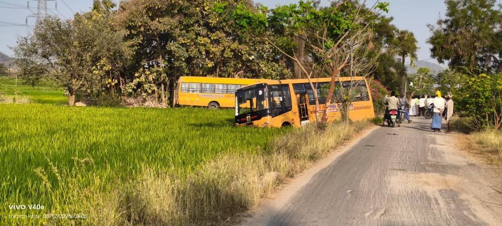 పయనించే సూర్యుడు న్యూస్:మార్చి:13: నియోజకవర్గం స్టాప్ రిపోర్టార్:సాయిరెడ్డి బొల్లం: రాజన్న సిరిసిల్ల జిల్లా మానకొండూర్ నియోజకవర్గం ఇల్లంతకుంట మండలం లోని ఈరోజు గురువారం రోజున :12/03/2026: వెంకట్రాపూర్ నుండి జంగం రెడ్డిపల్లె వచ్చే దారిలో శ్రీ వాణి ప్రైవేట్ హైస్కూల్ చెందిన స్కూల్ బస్ రోడ్డు పక్కన ఉన్న దూసుకెళ్లింది. బస్సులో ఉన్న విద్యార్థులు కొంతసేపు ఉద్రిక్త పరిస్థితి నెలకొన్నారు. స్థానిక వివరాలు ప్రకారంగా విద్యార్థులకు పాఠశాలకు వెళ్ళింది సమయంతో బస్ డ్రైవర్ కు నియంత్రణ కోల్పోవడంతో వాహనాం రోడ్డును వదిలి పంట పొలంలోకి దూసుకుపోయింది. అదృష్టవశాత్తు బస్సులో ఉన్న విద్యార్థులకు పెద్దగా గాయాలు ఏమీ కాలేదు భారీ ప్రమాదానికి తప్పించుకున్న ఘటనను గమనించి గ్రామస్తులు వెంటనే అక్కడికి చేరుకొని విద్యార్థులను సురక్షితంగా బయటకు తీసుకొచ్చారు. ఈ ఘటనపై స్పందించిన ఏ ఐ ఎస్ ఎఫ్ జిల్లా కార్యదర్శి మంద అనిల్ కుమార్, శ్రీవాణి ప్రైవేట్ పాఠశాల యాజమాన్యంపై తీవ్ర విమర్శలు చేశారు. ప్రైవేటు పాఠశాలలో చదివిస్తున్న వ్యక్తులు. స్కూలుకు వెళుతున్నారా లేదా అని బస్సులో కండిషన్ ఏ విధంగా ఉంది. గదిలో ఉన్నాయా లేవా. ప్రైవేటు స్కూళ్లలో అన్ని సౌకర్యాలు ఉన్నాయా లేవా. అని తెలుసుకోవాలి.