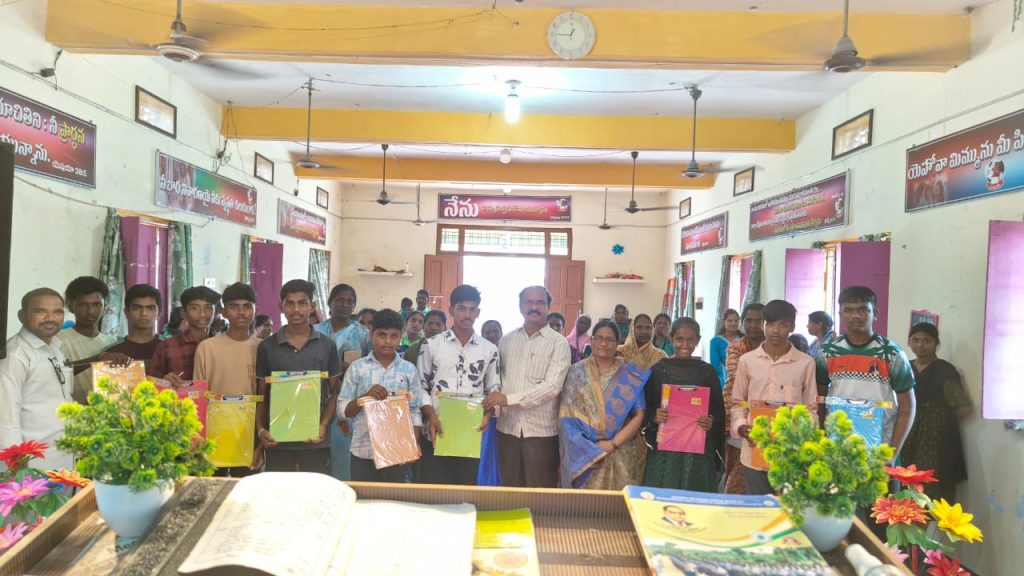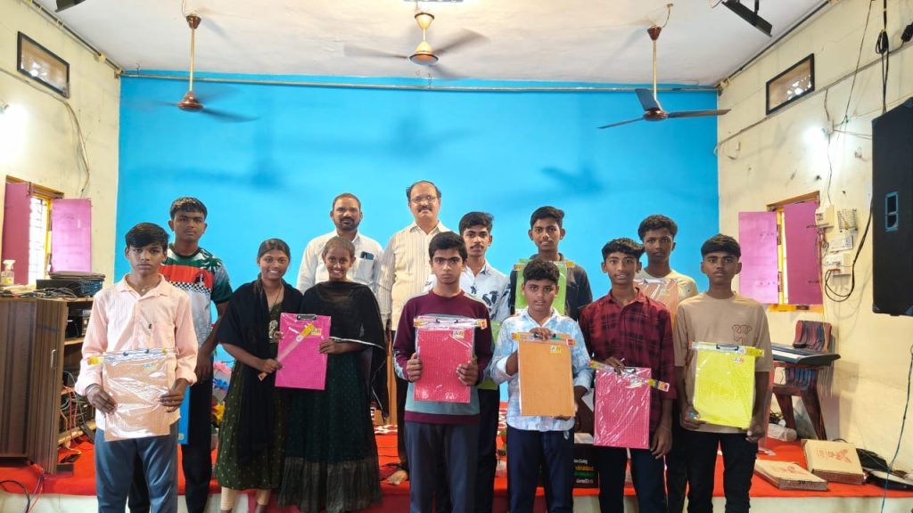 పయనించే సూర్యుడు రిపోర్టర్ జగయ్యపేట నియోజకవర్గం ఇన్చార్జి చేని రాంబాబు ఎన్టీఆర్ జిల్లా జగయ్యపేట్ట నియోజకవర్గం మార్చి 17 పెనుగంచిప్రోలు గ్రామంలోని ఈరోజున. జేజిఎం మందిరంలో రేపు జరగబోతున్న పదవ తరగతి పరీక్షలకు హాజరయ్యే విద్యార్థిని విద్యార్థులకు సంఘం స్థాపించినప్పుడు నుండి పేద ప్రజలకి హెల్పింగ్ నేచర్ తో ముందుకు దూసుకు వెళ్తున్న సంఘం జేజీఎం సంఘం తరఫున పాస్టర్ జోసఫ్ పాల్ ఆధ్వర్యంలో వారికున్న సహృదయంతో సంఘం తరఫున రేపు జరగనున్న పరీక్ష రాస్తున్న 10వ తరగతి విద్యార్థిని విద్యార్థులకు ఫ్యాట్స్ పెన్నులు స్కేలు సుమారు 30 మంది విద్యార్థులకు పంపిణీ చేయడం జరిగింది ఆ విద్యార్థులందరూ పరీక్షలు మంచిగా రాయాలని జేజిఎం సంఘం తరఫున ఆ విద్యార్థి విద్యార్థులకు మంచి మార్కులతో మంచి వృత్తినులై తల్లిదండ్రులకు మంచి పేరు తేవాలని చదువుకున్న స్కూల్ కి పేరు ప్రతిష్టలు రావాలని ఆ విద్యార్థి విద్యార్థులకు జేజిఎం సంఘం తరఫున ప్రార్థనలు చేయటం జరిగింది ఈ కార్యక్రమంలో పాస్టర్ జోసెఫ్ పాల్ మరియు సంఘం సభ్యులు ఈకార్యక్రమంలో పాల్గొనడం జరిగింది