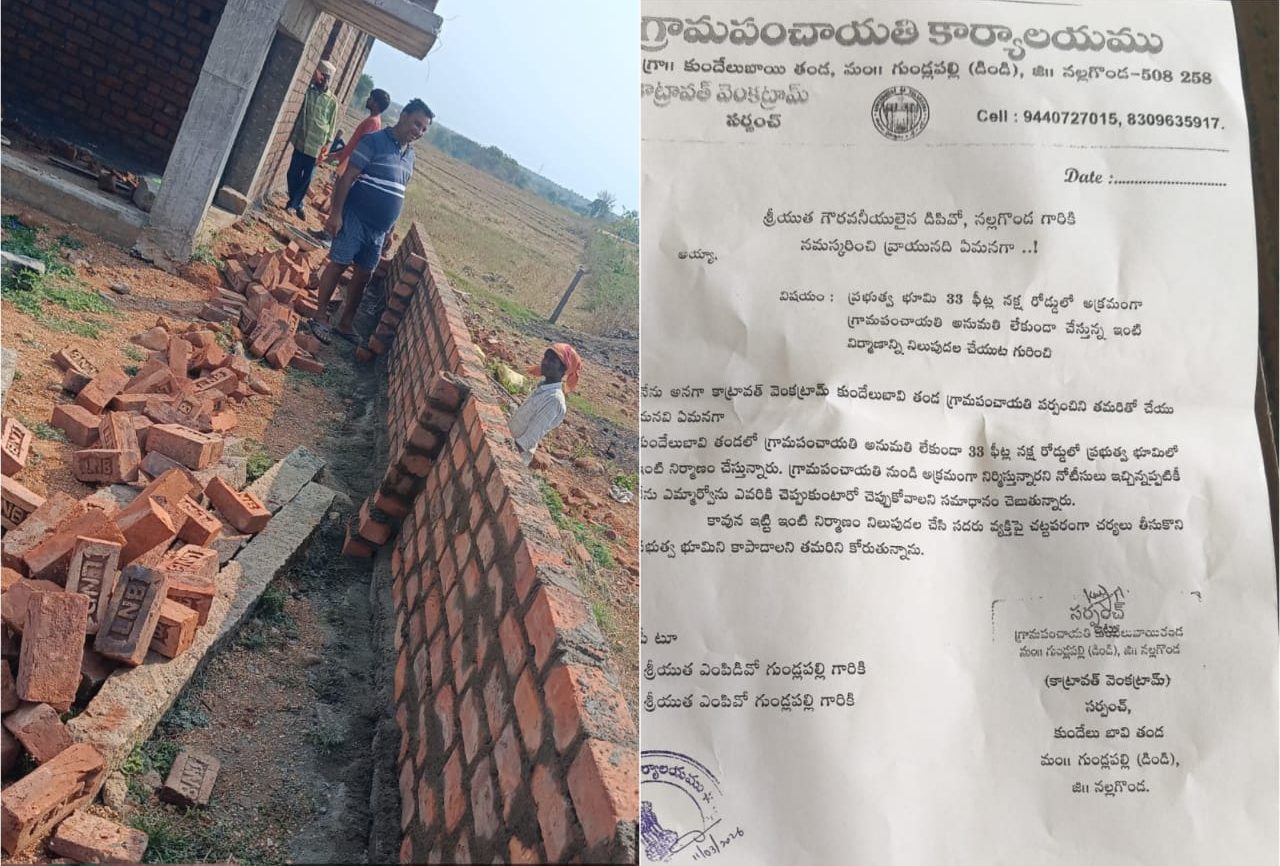 పయనించే సూర్యుడు మార్చ్ 19 (ప్రతినిధి జి సుధాకర్ డిండి మండలం నల్గొండ జిల్లా) డిండి మండలంలోని కుందేలు బాయ్ తండా గ్రామపంచాయతీ పరిధిలోని అనుమతి లేకుండా 33 ఫీట్ల నక్ష రోడ్డు లో ప్రభుత్వ భూమిలో ఇంటి నిర్మాణం చేస్తున్నారు. గ్రామపంచాయతీ నుండి అక్రమంగా నిర్మిస్తున్నారని నోటీసులు ఇచ్చిన నేను అధికారిని ఎవరికి చెప్పుకుంటారో చెప్పుకోవాలని సమాధానం చెబుతున్నారు. దయచేసి ఇట్టి ఇంటి నిర్మాణం నిలుపుదల చేసి సదర్ వ్యక్తిపై చట్టపరంగా చర్యలు తీసుకోవాలని ప్రభుత్వ భూమిని కాపాడాలని గ్రామ సర్పంచి కాట్రావత్ వెంకట్రాం, గ్రామ ప్రజలు అధికారులను కోరుతున్నారు. లేనిపక్షంలో పై అధికారులను ఆశ్రయించి ప్రభుత్వ భూమిని కాపాడుతామని తెలిపారు.