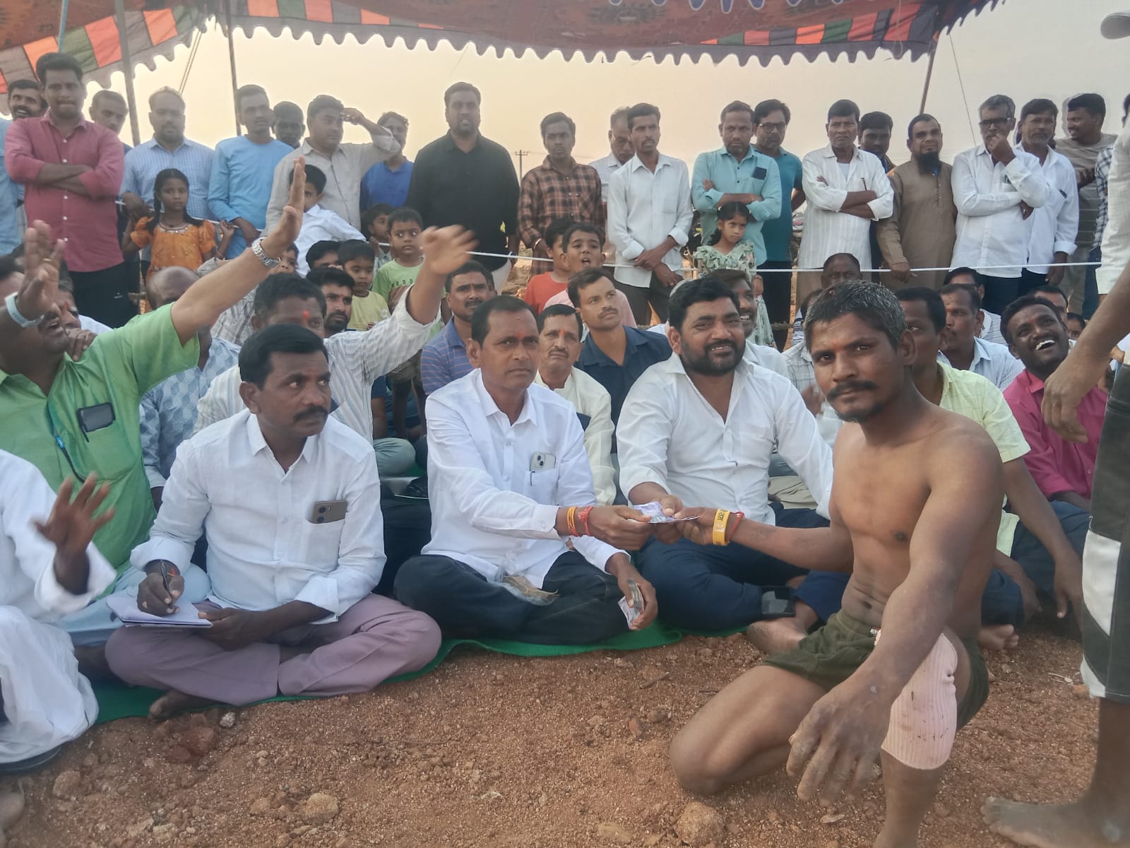* గెలిచినా మల్లయోధులకు నగదు అందచేస్తున్న గ్రామ పెద్దలు