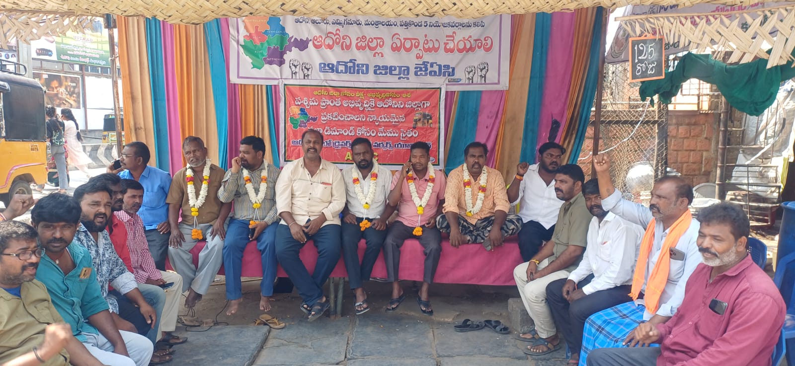 పయనించే సూర్యుడు మార్చి 21 కర్నూలు జిల్లా ఇంచార్జ్ శ్రీకాంత్. “125 రోజుల నిరంతర పోరాటం – ఆదోని జిల్లాగా ప్రకటించే వరకు ఉద్యమం ఆగదు” పశ్చిమ ప్రాంతంలోని ఆదోని, ఆలూరు, పత్తికొండ, ఎమ్మిగనూరు, మంత్రాలయం నియోజకవర్గాల సమగ్ర అభివృద్ధి కోసం ఆదోని జిల్లాగా ప్రకటించాలనే డిమాండ్‌తో జేఏసీ ఆధ్వర్యంలో జరుగుతున్న రిలే నిరాహార దీక్షలు ఈరోజుతో 125వ రోజుకు చేరుకున్నాయి. ఈ సందర్భంగా 125వ రోజు దీక్షను సిపిఐ పట్టణ కార్యదర్శి టి. వీరేష్ సహాయ కార్యదర్శిలు యు లక్ష్మీనారాయణ కే రమేష్ కుమార్ ఏఐవైఎఫ్ మటన్ కార్యదర్శి జి అంజిత్ కుమార్ నాయకత్వంలో నిర్వహించగా, ఏఐటీయూసీ అనుబంధ సంఘమైన ఆదోని ఆటో డ్రైవర్స్ అండ్ వర్కర్స్ యూనియన్ నాయకులు సి. నరసింహులు, శ్రీరాములు, ఎన్. ఈరన్న, ఏ. శంకర్ ఆధ్వర్యంలో ఆటో యూనియన్ సభ్యులు పాల్గొన్నారు.ఈరోజు దీక్షలో కూర్చున్న వారు: అంజి, ఏ. శంకర్, ఈరేష్, పి. శేక్షావలి, వెంకటేష్ 125 రోజుల పోరాటం – వివిధ రూపాల్లో ప్రజా ఉద్యమాలు ఈ 125 రోజుల కాలంలో ఆదోని జిల్లా సాధనకై జేఏసీ ఆధ్వర్యంలో అనేక రూపాల్లో నిరంతర ఉద్యమాలు నిర్వహించబడ్డాయి: రిలే నిరాహార దీక్షలు (నిరంతరంగా) ర్యాలీలు, భారీ ప్రదర్శనలు ధర్నాలు, రాస్తారోకోలు ప్రజా ప్రతినిధులకు వినతిపత్రాల సమర్పణగ్రామ గ్రామాన అవగాహన కార్యక్రమాలు కార్మిక సంఘాలు, వ్యాపార వర్గాల మద్దతుతో నిరసనలు విద్యార్థి, యువజన, మహిళా సంఘాల భాగస్వామ్యం సామాజిక మాధ్యమాల ద్వారా ప్రచారంఆటో కార్మికులకు కలిగే ప్రయోజనాలు ఆదోని జిల్లాగా ప్రకటిస్తే ఆటో డ్రైవర్లు మరియు కార్మికులకు ముఖ్యంగా ఈ క్రింది లాభాలు కలుగుతాయి:జిల్లా కేంద్రంగా మారడం వల్ల ప్రయాణికుల రద్దీ పెరిగి ఆదాయం పెరుగుతుంది కొత్త ప్రభుత్వ కార్యాలయాలు, ఆసుపత్రులు, విద్యాసంస్థలు ఏర్పడడంతో రోజువారీ ట్రిప్స్ పెరుగుతాయిరవాణా సదుపాయాల అభివృద్ధితో ఆటోలకు మరిన్ని రూట్లు లభిస్తాయిఆటో స్టాండ్లు, పార్కింగ్ సదుపాయాలు ప్రభుత్వ ఆధ్వర్యంలో మెరుగుపడే అవకాశం ఉంటుంది లైసెన్సులు, పర్మిట్లు, రిజిస్ట్రేషన్ వంటి పనులు స్థానికంగా సులభంగా పూర్తవుతాయి ప్రభుత్వ పథకాలు, బీమా, సబ్సిడీలు ఆటో కార్మికులకు సులభంగా అందుబాటులోకి వస్తాయికొత్త ఉపాధి అవకాశాలతో యువత ఆటో రంగంలోకి రావడానికి అవకాశాలు పెరుగుతాయినాయకుల ప్రసంగాల ముఖ్యాంశాలు ఈ కార్యక్రమాన్ని ఉద్దేశించి జేఏసీ నాయకులు టి. వీరేష్, పి. కోదండ, వై.పి. నాగరాజ్, దాసరి గోవిందు, సుజ్ఞానమ్మ, రామలింగయ్య, రామాంజనేయులు, బాలస్వామి, సుభాష్ చంద్రబోస్ మాట్లాడుతూ: ఆదోని జిల్లాగా ప్రకటిస్తే పశ్చిమ ప్రాంతం సమగ్ర అభివృద్ధి చెందుతుందివిద్య, వైద్య, వ్యవసాయ రంగాల్లో అభివృద్ధి జరుగుతుందిపరిపాలన సౌలభ్యం పెరిగి ప్రజలకు సేవలు దగ్గరగా అంద