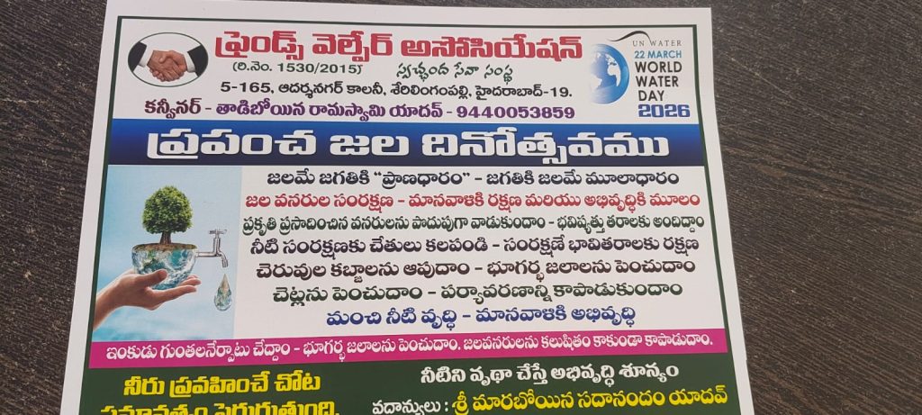 పయనించే సూర్యుడు, మార్చి 21 రంగారెడ్డిజిల్లాప్రతినిధి(ఎస్ఎంకుమార్) ఈరోజు ఫ్రెండ్స్ వెల్ఫేర్ అసోసియేషన్ కన్వీనర్ తాడిబోయిన రామస్వామి యాదవ్ ఆధ్వర్యంలో హఫీజ్ పేటలో గల జల మండలి జనరల్ మేనేజర్ కార్యాలయములో ప్రపంచ జల దినో త్సవ అవగాహనపై ముద్రించిన గోడప త్రికను హైదరాబాదు మహానగర జల మండలి ఎగ్జిక్యూటివ్ డైరెక్టర్ శ్రీ సంతోష్ రెడ్డి, ఛీఫ్ జనరల్ మేనేజర్ శ్రీనివాస్ రెడ్డి, 15వ డివిజన్ జనరల్ మేనేజర్ రమావత్ కృష్ణగార్లు ఆవిష్క రించి తదనంతరం వారు మాట్లాడుతూ ” *ఐక్యరాజ్యసమితి వారు మార్చి 22వ తేదీని ప్రపంచ జల దినోత్సవముగా ప్రకటించి ప్రతి సంవత్స రం వివిధ అవగాహన కార్యక్రమాలు చేపడుతు న్నారు.ఈ కార్యక్రమం యొక్క ప్రధాన ఉద్దేశ్యం ప్రకృతి ప్రసాదించిన నీటిని పొదుపుగా వాడుకోవడంతో పాటు, భూ గర్భ జలాలు కలుషితం కాకుండా చూడటమే ప్రధాన లక్ష్యంగా ప్రతి సంవ త్సరం ఒక నినాదంతో నిర్వహిస్తున్నారు. ఈ సంవత్సరపు నినాదం ‘నీరుప్రహించే చోట -సమానత్వం వికసిస్తుంది_రో జురోజుకూ భూ తాపం పెరిగిపోతుంది. దానికి కారణం గ్రీన్ హౌస్ వాయు ఉద్గా రాలతో పాటు, చెట్లను ఇష్టారీతిని నరకి వేయడం, ప్లాస్టి క్ వినియోగం అధికమ వడం, ప్రకృతి ప్రసాదించిన వనరులను అవసరానికి మించి వాడటం వలన,భూ గర్భ జలాలు కలుషితం అవడం వలన పర్యావరణంలో పెను మార్పులు సంభ వించి,మంచు కొండలు కరగి సముద్ర జలాలలో కలవడం వలన, సముద్రమ ట్టం పెరగడంతో పాటు వరదలు,కరువు లు, కొండచరియలు విరిగి పడడం వలన పర్యావరణ వ్యవస్థలు దెబ్బతింటున్నా యి”అని అన్నారు.”ప్రపంచ నాగరికత అంతా నదీతీర పరీ వాహక ప్రాంతాల లో నే యినుమ డించిం ది”అని అన్నా రు.భూ గోళంలో 97శాతము ఉప్పునీ రే.మిగతా 3శాతము నదులు,సర స్సులు,మంచు పర్వతాలు భూ గర్భ జలాల ద్వారా నీరు లభిస్తుంది. కేవలం నదులు,సరస్సులు మరియు భూగర్భ జలాల ద్వారా లభించే నీరు మాత్రమే త్రాగునీరు,సా గునీరు పారిశ్రా మిక విని యోగానికి ఉపయోగపడుతు న్నాయి.సకల జీవ కోటికి గాలి తరువాత నీరే ప్రధాన మయినది.చెరు వుల ద్వారా 0.86%, నదుల ద్వారా 0.02%, భూగర్భ జలాల ద్వారా 0.12% మాత్రమే నీరు లభ్యమ వుతున్నది. ఒకవైపు జనాభా పెరిగిపోవ డం,మరోవైపు భూగర్భ జలా లు రోజు రోజుకూ అడుగంటడంతో పారిశ్రామిక అవసరాలు కూడా పెరగ డంతో ప్రపం చలో 80 దేశాలు త్రాగు నీటి సమస్యత కొట్టుమిట్టాడుతున్నా యి.మానవుడు సం పూర్ణ ఆరోగ్యంగా ఉండాలంటే త్రాగే నీరు,భుజించే ఆహా రం, నివసించే ప్రదే శం వ్యక్తిగత పరి శుభ్ర త ప్రధానమైన మి.లోయ,అటవీ ప్రాంతాలలో నివసించే ప్రజలు పరిశు భ్రమైన త్రాగు నీరు లభించక అనేక వ్యాధులకు గురై సంవత్సరానికి ప్రపం చం మొత్తంలో 40 లక్షల మంది మృ త్యు వాత పడుతున్నారని అన్నా రు.”ముఖ్యంగా చిన్నపిల్ల లు అతిసార వ్యాధితో బాధపడుతున్నా రు. అవన్నీ కూడా అభివృ