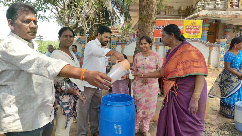 పయనించే సూర్యుడు మార్చి 21, కాకినాడ జిల్లా కాకినాడ రూరల్ (బి వి బి) వేసవి దాహార్తి ని తెచ్చేందుకు గత 14 సంవత్సరాలుగా వేసవి లో మూడు నెలలు పాటు మజ్జిగ చలివేంద్రాలను ఏర్పాటు చేస్తున్న మీనాక్షి రాంబాబు దంపతుల సేవలు అభినందనీయమని తిమ్మాపురం గ్రామ జనసేన పార్టీ గౌరవ అధ్యక్షులు మాదారపు తాతాజీ పేర్కొన్నారు. శుక్రవారం తిమ్మాపురం జనసేన పార్టీ కార్యాలయం ఎదురుగా శ్రీ షిరిడి సాయి మందిర్ వద్ద శ్రీ సద్గురు సాయి బాబా ట్రస్ట్ ఆధ్వర్యంలో వ్యవస్థాపక అధ్యక్షులు రాంబాబు మీనాక్షి దంపతులు ఆధ్వర్యంలో మజ్జిగ చలివేంద్రాన్ని తాతాజీ ప్రారంభించారు. ఈ సందర్భంగా వారు మాట్లాడుతూ మ గురువర్యులు మామిడిపల్లి రామారావు లక్ష్మీ దంపతుల ఆశీస్సులతో గత 14 సంవత్సరాలుగా వేసవికాలంలో ప్రజల దాహార్తిని తీర్చేందుకు మా వంతు కృషిగా మజ్జిగ, లస్సి చలివేంద్రాలను ఏర్పాటు చేయడం జరుగుతుందని అన్నారు. తిమ్మాపురం గ్రామం లో గత రెండు సంవత్సరాలుగా చలివేంద్రంలో ఏర్పాటు చేశామని అన్నారు. అలాగే అందుల పాఠశాలలలో ప్రతి సంవత్సరం క్రమం తప్పకుండా ఫ్రూట్ సలాడ్, కేకులు, డ్రింక్స్, పుస్తకాలు పెన్నులు అవసరమైన వారికి దుస్తులు పంపిణీ చేయడం జరుగుతుందని అన్నారు. ఈ కార్యక్రమంలో తిమ్మాపురం పోలీస్ లు రమేష్, శ్రీమన్నారాయణ ,శివ విష్ణు, సుబ్బు, తోట తాగారు ప్రసన్నకుమార్ మాదాలకు తాతాజీ ట్రస్ట్ సభ్యులు గ్రామస్తులు పాల్గొన్నారు.