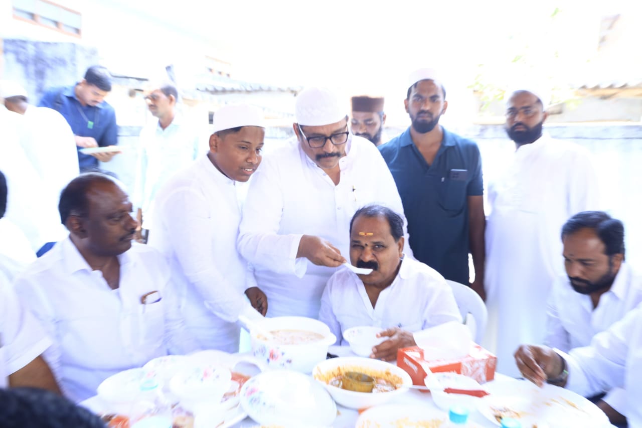 పయనించే సూర్యుడు 22 మార్చ్ 20 26 తెలంగాణ రంగారెడ్డి జిల్లా షాద్నగర్ కొందరు మండల్ శ్రీరంగాపూర్ రిపోర్టర్ నరేష్. కొందుర్గ్ మండల్ శ్రీరాంగాపూర్ గ్రామంలో రంజాన్ వేడుకలు ఘనంగా నిర్వహించుకున్నారు కులమతాలకు అతీతంగా భిన్నత్వంలో ఏకత్వం అన్నట్టుగా హిందూ ముస్లిం కలిసి ఐకమత్యంతో రంజాన్ వేడుకను జరుపుకోవడం జరిగింది. ఈ కార్యక్రమాన్ని మాజీ మార్కెట్ కమిటీ వైస్ చైర్మన్ సయ్యద్ సాదిక్ ఘనంగా విందు నిర్వహించే షాద్నగర్ నియోజకవర్గం స్థానిక ఎమ్మెల్యే వీర్లపల్లి శంకర్ అన్న ముఖ్య అతిథిగా విచ్చేయడం జరిగింది ఈ విందులో భాగంగా మాజీ ఎమ్మెల్యే ప్రతాప్ రెడ్డి పాల్గొని విందును స్వీకరించి కులమతాలకు అతీతంగా ఈ రంజాన్ పండుగ జరుపుకోవడం సంతోషకరం అని ముస్లిం సోదరులకు రంజాన్ పండుగ శుభాకాంక్షలు తెలియజేశారు ఈ కార్యక్రమానికి కొందూరు మండల కాంగ్రెస్ పార్టీ నాయకులు కేకే కృష్ణ రెడ్డి మంగులాల్ నాయక్ షాద్నగర్ వైస్ కౌన్సిలర్ అందే మోహన్ శ్రీరంగాపూర్ గ్రామ సర్పంచ్ రమేష్ డిప్యూటీ సర్పంచ్ ముస్త పమరియు వార్డు మెంబర్స్ యూత్ నాయకులు గ్రామ ప్రజలు పాల్గొన్నారు.
