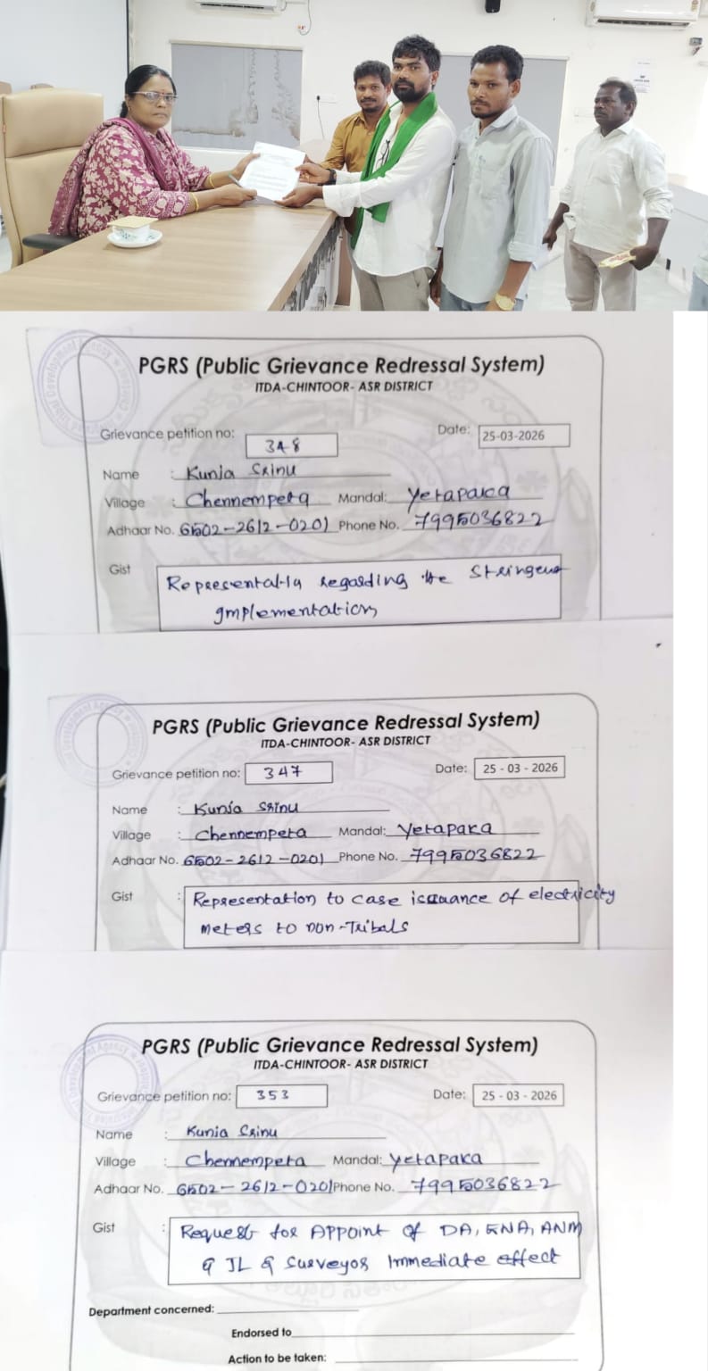 పయనించే సూర్యడు ప్రతినిధి సాగర్ మర్చి. 26.2026 పోలవరం జిల్లా, రంపచోడవరం నియోజకవర్గం చింతూరు ఐటిడిఏ పరిధిలోని చింతూరు, వి.ఆర్.పురం,కూనవరం మరియు ఎటపాక మండలాల్లో గిరిజన చట్టాల ఉల్లంఘనలు తీవ్రస్థాయికి చేరుకున్నాయని.ఆదివాసీ సంక్షేమ పరిషత్ రాష్ట్ర ప్రధాన కార్యదర్శి కుంజా శ్రీను ఆందోళన వ్యక్తం చేశారు.బుధవారం చింతూరులో జరిగిన. ప్రజా గ్రీవెన్స్లో ఐటీడీఏ ఏవోకు ఈ మేరకు వినతి పత్రం అందజేశారు.ఈ సందర్భంగా ఆయన మాట్లాడుతూ ఐదవ షెడ్యూల్ ప్రాంతాల్లో 1/70 చట్టం అమలులో ఉన్నప్పటికీ,గిరిజనేతరులు అక్రమంగా భూములను ఆక్రమించి.వాణిజ్య సముదాయాలు,జామాయిల్ తోటలు సాగు చేస్తున్నారని మండిపడ్డారు. ముఖ్యంగా ఏజెన్సీ ప్రాంతాల్లో గిరిజనేతరులకు విద్యుత్ మీటర్ల జారీని వెంటనే నిలిపివేయాలని, నిబంధనలకు విరుద్ధంగా ఉన్న పాత కనెక్షన్లను తొలగించాలని డిమాండ్ చేశారు. మండల కేంద్రాల్లో ప్రభుత్వ అవసరాలకు కూడా భూమి లేకుండా అక్రమ కట్టడాలు వెలిశాయని, అధికారులు వెంటనే ప్రత్యేక డ్రైవ్ చేపట్టి ఆక్రమణలను తొలగించాలని కోరారు. హైకోర్టు ఆదేశాల ప్రకారం ఆదివాసీల రాజ్యాంగ హక్కులను కాపాడాలని,నిర్లక్ష్యం వహిస్తున్న అధికారులపై చర్యలు తీసుకోవాలని కుంజా శ్రీను ప్రభుత్వాన్ని డిమాండ్ చేశారు.ప్రస్తుతం నాలుగు మండల పరిధిలో ఉన్న పలు సచివలయంల్లో సిబ్బంది.కొరత ఉందని చాలా మంది సిబ్బందిని పోలవరం ఆర్ అండ్ ఆర్ సెంటర్లో డిప్యుటేషన్ వేశారు.మరి కొంతమంది ఇంచార్జీ గా వ్యవహరిస్తున్నారు. సిబ్బంది కొరత వల్ల సామాన్య ప్రజలకు సచివలయ సేవలు సకాలంలో అందటం లేదని ఆయన ఆవేదన వ్యక్తపరిచారు. సచివాలయంలో ఖాళీలను తక్షణమే భర్తీ చేయాలని ఆయన. ఈ సందర్భంగా ప్రభుత్వాన్ని డిమాండ్ చేశారు.ఈ కార్యక్రమంలో ఆదివాసి సంక్షేమ పరిషత్ చింతూరు డివిజన్ అధ్యక్షులు కూర చిట్టి బాబు, పరదా శివరామకృష్ణ, వెంకటేష్ తదితరులు పాల్గొన్నారు. కుంజా శ్రీను ఆదివాసి సంక్షేమ పరిషత్