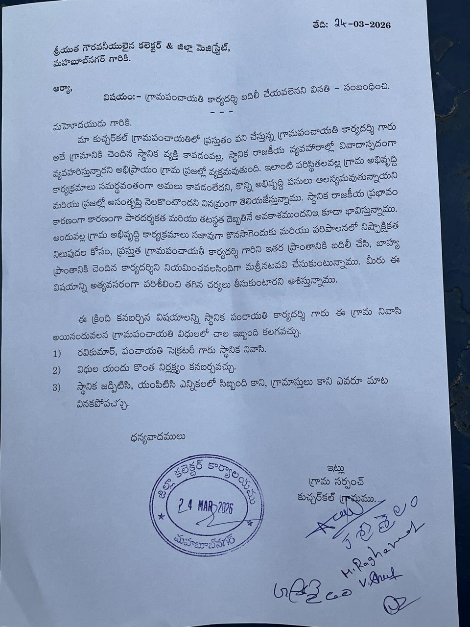 పయనించే సూర్యుడు మార్చి 26, మహబూబ్ నగర్ జిల్లా రిపోర్టర్ నరిగె కళాశేఖర్: రాజాపూర్ మండలం కుచర్కల్ గ్రామ పంచాయతీలో వింత పరిస్థితి నెలకొంది.వివరాల్లోకి వెళితే మహబూబ్నగర్ జిల్లా రాజాపూర్ మండలం కుచర్కల్ గ్రామ సర్పంచ్ తెలిపిన వివరాల ప్రకారం తమ గ్రామ పంచాయతీ కార్యదర్శిగా విధులు నిర్వహిస్తున్న రవికుమార్ అదే గ్రామానికి చెందిన వారు కావడంతో, విధుల్లో కొంత నిర్లక్ష్యం వహిస్తున్నారనీ, గ్రామ అభివృద్ధి కుంటుపడుతోందని , ఇప్పటికే మూడు సార్లు కార్యదర్శులు మారడం , స్థానిక రాజకీయ వ్యవహారాల్లో జోక్యం చేసుకోవడం వల్ల గ్రామంలో మరింత వేగవంతమయ్యే అభివృద్ధి కార్యక్రమాలు ఆలస్యము అవుతాయని గ్రామస్తులు , గ్రామ సర్పంచ్ అధ్వర్యంలో జిల్లా కలెక్టర్ను కలిసి వినతిపత్రం అందించారు. కార్యదర్శి స్థానిక నివాసి కావడంతో పక్షపాత ధోరణి కన్పించే అవకాశం ఉందని ఆవేదన వ్యక్తం చేశారు.అభివృద్ధి సాఫీగా సాగాలన్నా, పాలనలో నిష్పాక్షికత ఉండాలన్నా ప్రస్తుతం ఉన్న కార్యదర్శిని వేరే ప్రాంతానికి బదిలీ చేసి, బయటి ప్రాంతానికి చెందిన కార్యదర్శిని నియమించాలని సర్పంచ్, గ్రామ ప్రతినిధులు, పలువురు అభిప్రాయం వ్యక్తం చేశారు. ఈ విషయంపై స్పందించి తక్షణమే తగిన చర్యలు తీసుకోవాలని వారు కలెక్టర్ను కోరారు.. ఈ కార్యక్రమంలో కుచర్కల్ గ్రామ సర్పంచ్, పలువురు గ్రామస్తులు, పెద్దలు పాల్గొన్నారు