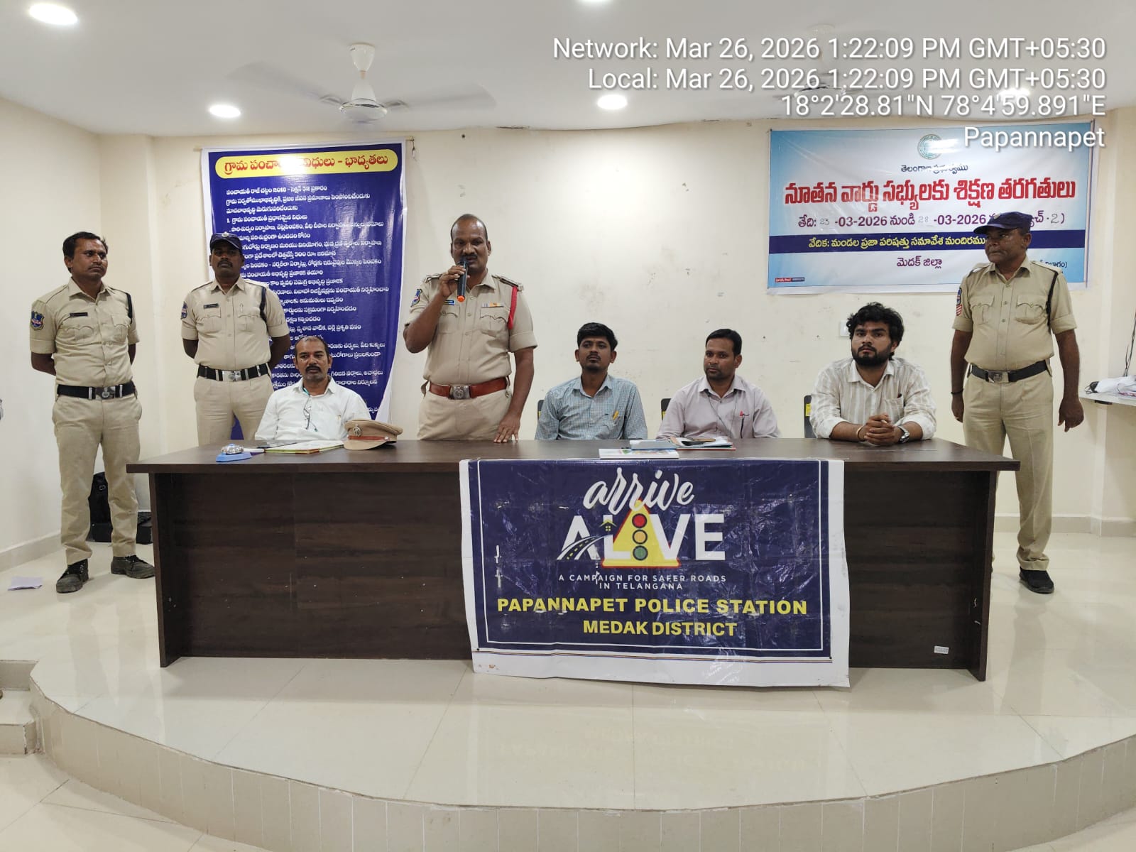 పయనించే సూర్యుడు మార్చ్ 27 పాపన్నపేట మండల రిపోర్టర్ దుర్గాప్రసాద్ రోడ్డు భద్రతా నియమాలు పాటించి ప్రమాదాలకు దూరంగా ఉండాలని పాపన్న పేట ఎస్ఐ శ్రీనివాస్ గౌడ్ పిలుపునిచ్చారు. పోలీస్ శాఖ ఆధ్వర్యంలో “అర్రేవ్ అ లీవ్” కార్యక్రమం లో భాగంగా మండల ప్రజా పరిషత్ కార్యాలయం లో ఉపసర్పంచ్, వార్డు సభ్యులకు శిక్షణ కార్యక్రమంలో భాగంగా” అరైవ్ -అలైవ్” అవగాహన కల్పించారు.ఇందులో భాగంగా గ్రామ పంచాయతీ ఉప సర్పంచ్లు, వార్డు సభ్యులు గ్రామ పంచాయతీ లలో ప్రజలకు ప్రమాదాల నివారణకు తమ వంతు గా ప్రజలకు రోడ్డు భద్రత, నియమాలు, నిబంధనల పై అవగాహన కల్పించాలని సూచించారు. ప్రభుత్వం రోడ్డు ప్రమాదాల నివారణకు ఎంతో ప్రాధాన్యత నిచ్చి అరైవ్- అలైవ్ కార్యక్రమం తో ప్రత్యేక కార్యక్రమాల ద్వారా అవగాహన కల్పించాలన్న తలంపుతో చేపట్టిన వారోత్సవాల్లో బాగంగా మెదక్ ఎస్పీ శ్రీనివాస్ రావు ఆదేశాల మేరకు గురువారం ప్రజా ప్రతినిధులను సైతం అవగాహన సదస్సులో భాగస్వాములుగా చేయాలన్న తలంపుతో గ్రామ పంచాయతీ ఉప సర్పంచ్, వార్డు సభ్యులకు అవగాహన కల్పించారు.వాహనదారులు హెల్మెట్ ధరించడం వల్ల ప్రాణాలకు రక్షణ కవచంల ఉంటుందని అందువల్ల ప్రతి ఒక్క వాహనదారుడు హెల్మెట్ తోపాటు సీటు బెల్టు ధరించాలన్నారు. రోడ్డు ప్రమాదాలు ఎక్కువగా నిర్లక్ష్యం, అతివేగం, మద్యం సేవించి వాహనాలు నడపడం, హెల్మెట్, సీటు బెల్టు ఉపయోగించకపోవడం వల్ల జరుగుతున్నాయన్నారు. రోడ్డు భద్రత అనేది కేవలంపోలీసుల బాధ్యత మాత్రమే కాదని ప్రతి వాహనదారుడు ప్రతి పౌరుడు బాధ్యతగావ్యవహరించినప్పుడే ప్రమాదాలను గణనీయంగా తగ్గించవచ్చునని ప్రజలకు అవగాహన కార్యక్రమాలు నిర్వహించాలని వారికి సూచించారు. ప్రజలు ట్రాఫిక్ నిబంధనలను తప్పనిసరిగా పాటిస్తూ తమతో పాటు ఇతరుల ప్రాణాలను కాపాడుకోవాలని విజ్ఞప్తి చేశారు.వాహనదారులు వాహనాలు నడిపేటప్పుడు రాంగ్ రూట్లో నడపకూడదని తెలియజేశారు. డ్రైవింగ్ చేసేటప్పుడు సెల్ఫోన్లను ఉప యోగించొద్దని, సెల్ ఫోన్ లో ఇతరులతో మాట్లాడకుండా డ్రైవింగ్ చేయాలని సూచించారు. చలికాలంలో మంచు కారణంగా ఓవర్టేక్ చేసేటప్పుడు జాగ్రత్తలు పాటించాలన్నారు. ఈ కార్యక్రమంలో ఎంపీ ఇఓ , వివిధ గ్రామాల ఉప సర్పంచులు, వార్డు సభ్యులు, శిక్షకులు పోలీసులు ఉన్నారు.
