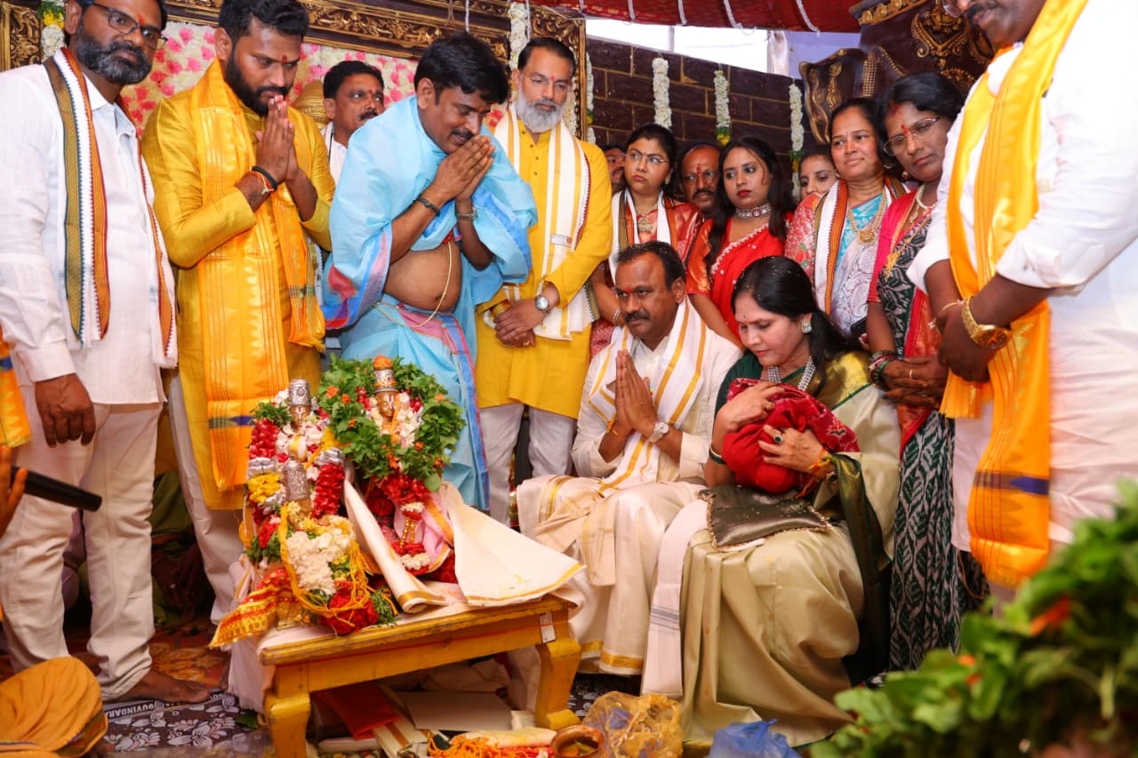 పయనించే సూర్యుడు న్యూస్ చౌటుప్పల్ మార్చి 28. చౌటుప్పల్ పట్టణంలోని బస్టాండ్ ఆవరణలో శ్రీరామనవమి వేడుకలు ఘనంగా జరిగాయి శ్రీరామనవమి వేడుకల్లో పాల్గొని శ్రీ సీతారామచంద్ర స్వాముల వారికి పట్టు వస్త్రాలు సమర్పించారు గౌరవ మునుగోడు శాసనసభ్యులు కోమటిరెడ్డి రాజగోపాల్ రెడ్డి దంపతులు శ్రీరామనవమి వేడుకలకు హాజరైన పుణ్య దాంపతులకు ఘన స్వాగతం పలికారు మున్సిపాలిటీ పాలకవర్గ సభ్యులు శ్రీ సీతారామచంద్రస్వామి కళ్యాణ వేడుకల పాలకవర్గ సభ్యులు… పట్టు వస్త్రాలు సమర్పించిన అనంతరం ప్రత్యేక పూజలు నిర్వహించారు పట్టు వస్త్రాలు సమర్పించిన దంపతులకు వేద ఆశీర్వచనం చేసారు అర్చకులు అనంతరం చౌటుప్పల్ మున్సిపాలిటీ పరిధిలోని తంగడపల్లి లో శ్రీ రామనవమి వేడుకల్లో పాల్గొని తన సతీమణి శ్రీమతి కోమటిరెడ్డి లక్ష్మి రాజ్ గోపాల్ రెడ్డి కలిసి ప్రత్యేక పూజలు నిర్వహించారు.