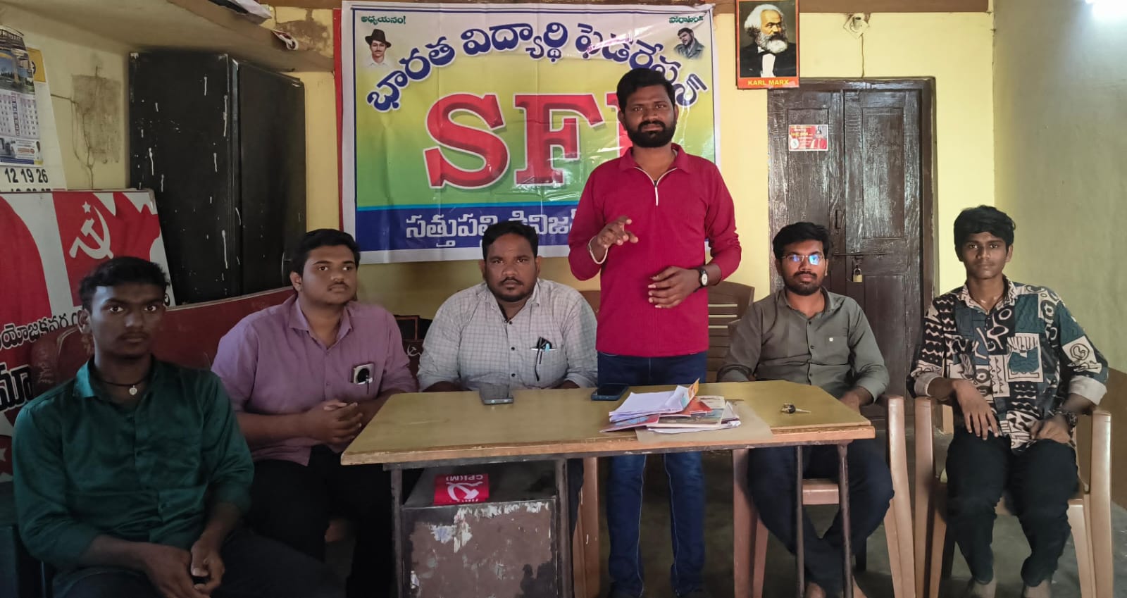 పయనించే సూర్యుడు: మార్చి 28/26 సత్తుపల్లి రూలర్: రిపోర్టర్: గద్దె. విజయబాబు ఖమ్మం జిల్లా పెనుబల్లి మండలం స్థానిక ప్రభుత్వ పాఠశాలలకు వేసవిలో ఇచ్చే ఒంటిపూట బడుల సమయపాలనను పెంచడానికి భారత విద్యార్థి ఫెడరేషన్ (ఎస్ఎఫ్ఐ) ఖండించింది. శుక్రవారం పెనుబల్లి కేంద్రంగా నిర్వహించిన సమావేశంలో జిల్లా కార్యదర్శి తుడుం ప్రవీణ్ మాట్లాడుతూ రాష్ట్రంలో ఎక్కడా లేని విధంగా కేవలం పెనుబల్లి మండలంలోని విద్యార్థులకు ఒంటిపూట బడుల సమయపాలన పెంచడం సరైనది కాదని, ఎండ తీవ్రత ఎక్కువగా ఉన్న సమయంలో అలాగే దగ్గరలో ఉన్నటువంటి సింగరేణి బొగ్గు గనుల నుండి వచ్చే వేడి వలన గాని ఈ వేసవిలో వచ్చే వడగల్పుల వలన విద్యార్థులకు నష్టం కలుగుతుంది కనుక రాష్ట్రంలో ఏ విధంగా అయితే నిర్వహిస్తున్నారో అదేవిధంగా పెనుబల్లి మండలం లో కూడా వంటి పూట బడుల సమయపాలన నిర్వహించాలని వెంటనే దీనిపై విద్యాశాఖ ఉన్నతఅధికారులు స్పందించాలని కోరారు. ఈ కార్యక్రమంలో ఎస్ఎఫ్ఐ జిల్లా అధ్యక్షులు వంకాయల రాజు, ఎస్ఎఫ్ఐ జిల్లా ఉపాధ్యక్షులు బెజవాడ సాయి శేషు, సత్తుపల్లి డివిజన్ అధ్యక్షులు భూక్య బాలాజీ నాయక్, డివిజన్ నాయకులు తురక అన్వేష్, ఎర్రబడి ప్రవీణ్ కుమార్, మెచ్చు కార్తీక్ తదితరులు పాల్గొన్నారు.