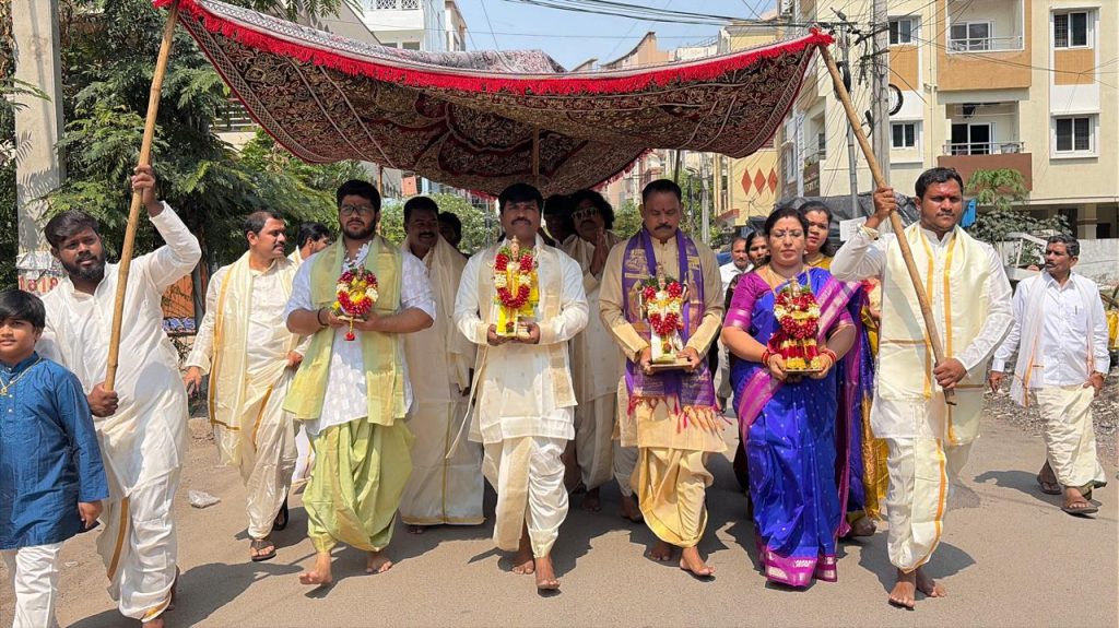 పయనించే సూర్యుడు, మార్చి 28రంగారెడ్డిజిల్లాప్రతినిధి (ఎస్ఎంకుమార్) ప్రగతి ఎన్క్లేవ్ కాలనీ అసోసియేషన్ ఆధ్వర్యంలో శ్రీ సీతారాముల వారి కల్యాణ మహోత్సవం ఘనంగా నిర్వహించబడింది. ఈ కార్యక్రమానికి కాలనీ అధ్యక్షులు అట్టేపల్లి రామప్రభు అధ్యక్షత వహించారు.ఈ పవిత్ర వేడు కలో అమ్మాయి తరఫున అట్టేపల్లి పురుషోత్తం,దయాకర్ వారి కుటుంబ సభ్యులు, అబ్బాయి తరఫున నాగిశెట్టి ప్రసాద్ పిల్లి నాగరాజు వారి కుటుంబ సభ్యులు పాల్గొని కార్యక్రమాన్ని శోభా య మానం చేశారు.ఈ కార్యక్రమంలో శేరిలింగంపల్లి ఎమ్మెల్యే అరెకపూడి గాంధీ మువ్వ సత్యనారాయణ మియా పూర్ మాజీ కార్పొరేటర్ ప్రసాద్ ఉప్పల పాటి శ్రీకాంత్ రఘునాథ్ రెడ్డి పురుషో త్తం యాదవ్ రామకృష్ణ గౌడ్ మహేష్ యాదవ్ గంగాధర్ నాగులు పటేల్. బిఎస్ఎన్ కిరణ్ యాదవ్ అట్టేపల్లి పురుషోత్తం సమ్మెట ప్రసాద్ , అట్టేపల్లి శ్రీరాములు,అట్టేపల్లి దయాకర్ , పిల్లి నాగరాజు డాక్టర్ రవికుమార్ రాజేం ద్ర ప్రసాద్ చౌదరి మొహమ్మద్ కాజా నాగిశెట్టి వినీత్ తంగెళ్ల సాయి తేజ అట్టేపల్లి ప్రశాంత్ నాయుడు చంద్రహస్ రాజశేఖర్ గిరి వినోద్ శ్రీకాంత్ చంద్రికా కల్పన ప్రీతి కమిటీ సభ్యులు కాలనీ మరియు మీడియా మిత్రులు పుట్ట వినయ్ మరియు కబీర్.ఎ ఆర్ పి టీం సభ్యులు పాల్గొన్నారు.ఈ వేడుకలో కాలనీ నివాసితులు భక్తిశ్రద్ధలతో పాల్గొ ని, శ్రీ సీతారాముల వారి దివ్య కల్యాణా న్ని దర్శించుకుని ఆశీర్వాదాలు పొందా రు. కార్యక్రమం ఆధ్యాత్మిక వాతావరణం లో ఎంతో వైభవంగా జరిగింది.ఈ సంద ర్భంగా నిర్వాహకులు అన్నదాన కార్యక్ర మాన్ని కూడా ఏర్పాటు చేసి,పాల్గొన్న భక్తులకు భోజన సదుపాయం కల్పించా రు.ఈ మహోత్సవాన్ని విజయ వంతంగా నిర్వహించినందుకు నిర్వాహక కమిటీ సభ్యులకు, సహకరించిన అందరికీ అధ్యక్షులు అట్టేపల్లి రామప్రభు కృత జ్ఞతలు తెలిపారు.