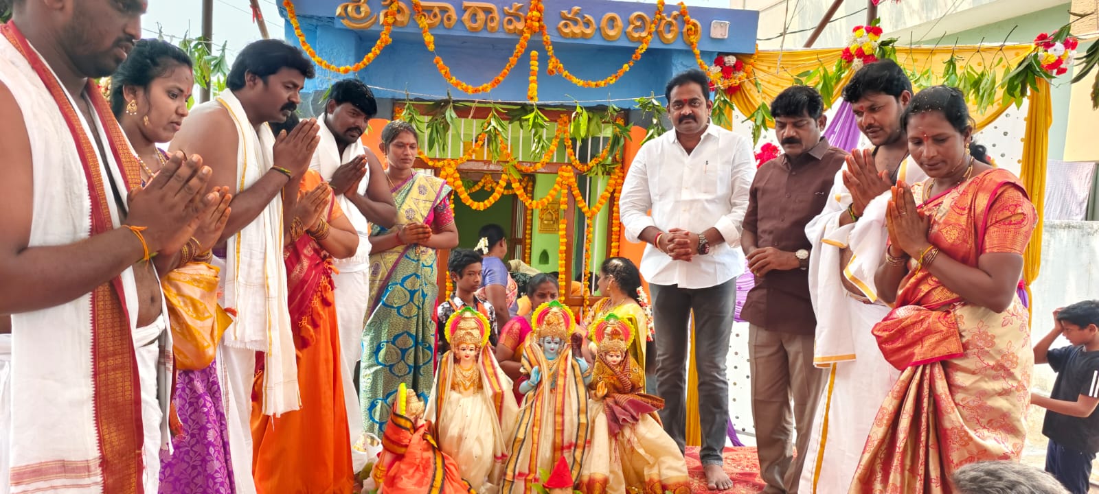 పయనించే సూర్యుడు రిపోర్టర్ జగయ్యపేట నియోజకవర్గం ఇన్చార్జి చేని రాంబాబు ఎన్టీఆర్ జిల్లా జగయ్యపేట్ట నియోజకవర్గం మార్చి 29 జగ్గయ్యపేట పట్టణంలోని కమ్మర బజార్ 26 వార్డులోని శ్రీ కోదండ రామాలయం దేవాలయం వద్ద స్థానిక ప్రజలు గోగుల వెంకయ్య దంపతులు మరియు కమిటీ సభ్యుల ఆధ్వర్యంలో నిర్వహించిన కళ్యాణ మహోత్సవానికి ముఖ్యఅతిథిగా వట్టెం మనోహర్ పాల్గొనడం జరిగింది ఈ కార్యక్రమంలో స్థానిక ప్రాంత నాయకులు మున్సిపల్ వైస్ చైర్మన్ తుమ్మల ప్రభాకర్ రావు కూడా పాల్గొని శ్రీరామనవమి కళ్యాణము వేడుకలు ఘనంగా నిర్వహించుకుని భక్తులకు తీర్థప్రసాదాలు అందజేయడం జరిగింది ఈ సందర్భంగా వట్టె మనోహర్ మాట్లాడుతూ జగ్గయ్యపేట నియోజకవర్గ ప్రజలకు మరియు దేశంలోని హిందువులందరికీ శ్రీరామనవమి శుభాకాంక్షలు ఆ శ్రీరాముడు సీతమ్మ తల్లి ఆశీస్సులు అందరికీ ఉండాలని రాబోయే రోజుల్లో ప్రజలందరికీ మంచి జరగాలని ఆ రాముడిని కోరుకున్నట్లు పత్రిక ముఖంగా తెలియజేశారు