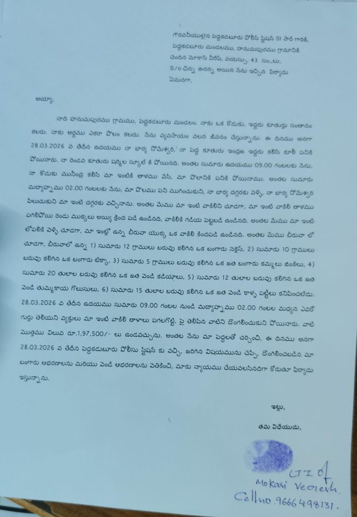 పయనించే సూర్యుడు న్యూస్ మార్చి 29 రిపోర్టర్ అభి పెద్దకడబురు మండలం హనుమాపురంలో తాళం వేసిన ఇంట్లో చోరీ జరిగింది. గ్రామానికి చెందిన మోకాసీ వీరేష్ కూలీ పనులకు వెళ్ళాడు. ఇంట్లో ఎవరూ లేని విషయాన్ని గమనించిన గుర్తుతెలియని వ్యక్తులు తాళం పగులగొట్టి బీరువాలో 12 గ్రాముల బంగారు నెక్లెస్, 10 గ్రాముల బంగారు టిక్కా, 5 గ్రాముల బంగారు కమ్మలు, 20 తులాల వెండి కడియాలు, 12 తులాల వెండి గొలుసులు, 15 తులాల వెండి కాళ్ల పట్టీలు ఎత్తుకెళ్లినట్లు బాధితుడు వీరేష్ తెలిపారు. ఈ ఆభరణాల మొత్తం విలువ సుమారు రూ.1,97,500గా అంచనా వేస్తున్నారు. దొంగతనంపై వీరేష్ పెద్దకడబూరు పోలీసులకు ఫిర్యాదు చేయగా.. దొంగతనం జరిగిన స్థలాన్ని ఎస్సై మారుతి పరిశీలించారు. కేసు నమోదు చేసి దర్యాప్తు చేస్తున్నట్లు మారుతి వెల్లడించారు