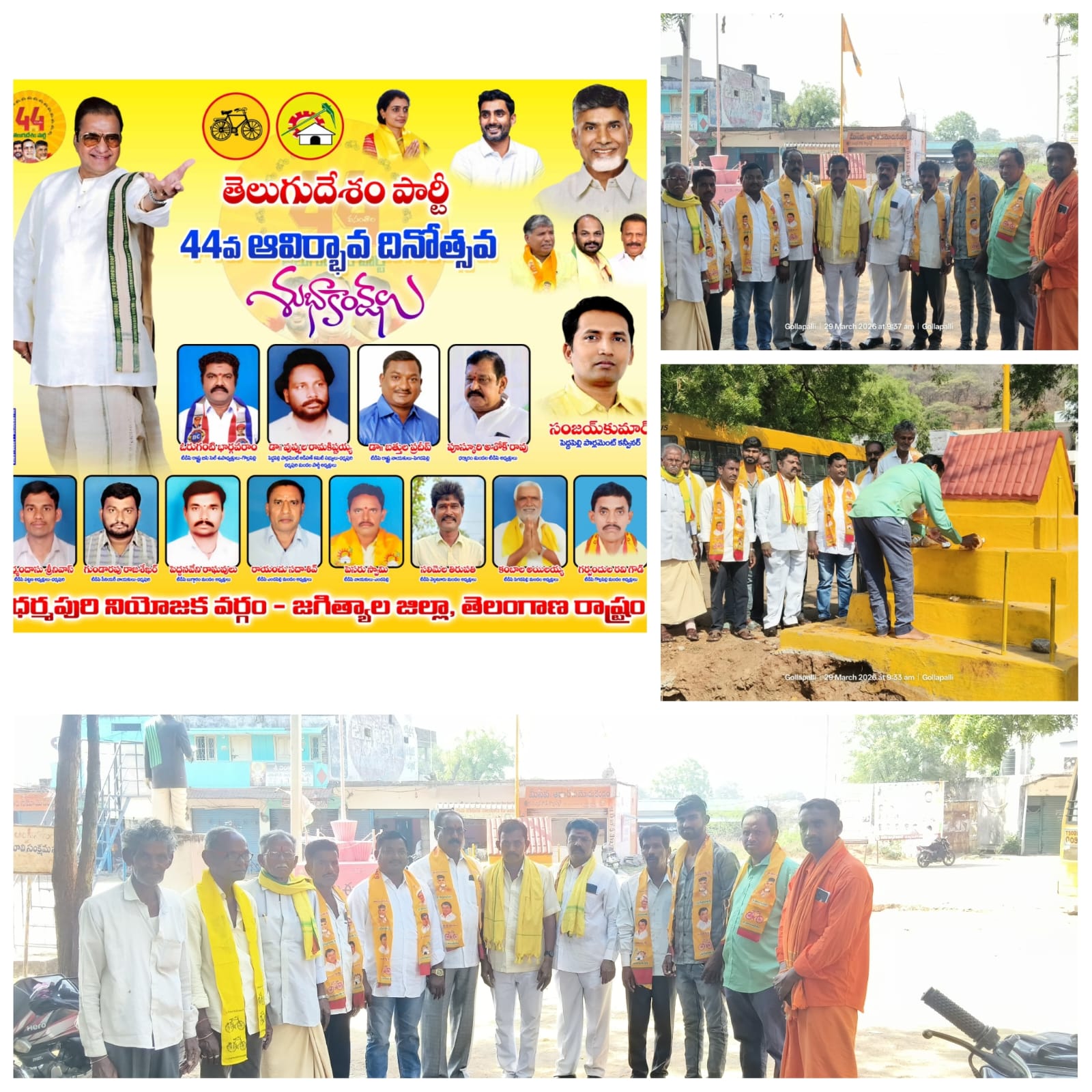 పయనించే సూర్యుడు 30-3-2026 గొల్లపల్లి మండల రిపోర్టర్ (ఆవుల చందు ) జగిత్యాల జిల్లా గొల్లపల్లి మండల కేంద్రంలో తెలుగుదేశం పార్టీ ఆవిర్భావ దినోత్సవము ఘనంగా నిర్వహించడం జరిగినది. తెలంగాణ తెలుగుదేశం పార్టీ బీసీ సెల్ రాష్ట్ర ఉపాధ్యక్షులు ఓరగంటి భార్గవరామ్ ఆధ్వర్యంలో ఈ కార్యక్రమం జరిగినది.ఈ సందర్భంగా వారు మాట్లాడుతూ 1982లో మార్చి 29వ తేదీ నాడు హైదరాబాదు ఎమ్మెల్యే క్వార్టర్స్ లో పార్టీని నందమూరి తారక రామారావు ఏర్పాటు చేసినారు అద్భుతమైన ముహూర్తం బలముతో తెలుగుదేశం పార్టీని స్థాపించి నేటికీ 44 సంవత్సరాలు అవుతున్న పార్టీ ప్రతిష్టమైన కార్యకర్తలతో తెలంగాణలో బలంగా ఉన్న పార్టీ స్థిరంగా ఉన్న కార్యకర్తలు ఒక తెలుగుదేశం పార్టీకే ఉన్నారు ఈనాడు తెలంగాణలో అధికారంలో లేకపోయినా ప్రతి గ్రామ గ్రామస్థాయిలో తెలుగుదేశం కార్యకర్తలు ప్రజలకు అందుబాటులో ఉంటూ సామాజిక కార్యక్రమాలను నిర్వహిస్తున్నారు. అలాగే ఎన్టీ రామారావు పార్టీ పెట్టిన వెంటనే తెలంగాణలో పోలీస్ పటేల్ మరియు పట్వారి వ్యవస్థలు వలన ఎస్సీ ఎస్టీ బీసీ వర్గాల ప్రజలను తీవ్రమైన హింసలకు గురి చేస్తున్నది.స్వయంగా చూసి తెలుగుదేశం పార్టీ అధికారంలోకి వచ్చిన వెంటనే ఈ పట్టి వారి వ్యవస్థలను కూకటి వేళ్ళతో పెకిలించినాడు బీసీ ఎస్సీ ఎస్టీలకు స్వేచ్ఛ కల్పించినాడు ఆ వర్గాల వారికి రాజకీయంగా స్వర్గీయ నందమూరి తారక రామారావు అండ దండలు అందిస్తూ ముందుకు పోయేలా తన శక్తిని సామాన్య జనానికి అందించిన మహానేత స్వర్గీయ నందమూరి తారక రామారావు ఆశీస్సులతో బీసీలు, ఎస్సీలు, ఎస్టీలు ఎమ్మెల్యేలుగా ఎంపీలుగా గెలిపించి వారిని మంత్రులుగా చేసినారు అప్పటి ఉమ్మడి ఆంధ్రప్రదేశ్ లో ఎన్టీ రామారావు పాలన శ్రీరామచంద్రుని పరిపాలనల అద్భుతమైన పరిపాలనందించినాడు అవినీతి రహితమైన రాష్ట్ర రాష్ట్రముగా తీర్చిదినాడు అందులో ముఖ్యంగా తెలంగాణలో అద్భుతమైన పరిపాలన అందించి రాజకీయాలకు దూరంగా ఉన్న వర్గాల వారిని ప్రోత్సహించి బీసీ రిజర్వేషన్లు మహిళా రిజర్వేషన్లు కల్పించి స్థానిక సంస్థల ఎన్నికలలో సర్పంచులుగా జెడ్పిటిసిలుగా జెడ్పీ చైర్మన్గా గా గెలిపించి బడుగు బలహీన దళిత వర్గాల సత్తా ఏంటిదో నిరూపించిన వ్యక్తి ఎన్టీ రామారావు ఆశీస్సులతో ఈనాడు తెలంగాణలో అన్ని పార్టీలలో ఎన్టి రామారావు అనే పరిశ్రమ నుండి తయారైన నాయకులే ముఖ్యమంత్రిగా మంత్రులుగా వెలుగొందుతున్నారు ఎన్టీ రామారావు ఆశీర్వాద బలం వల్ల మేము క్రియ శీల కార్యకర్తలుగా వెలుగొందుతున్నాం ఆనాడు ఎన్టీ రామారావు ముఖ్యమంత్రి అయిన వెంటనే పేద ప్రజలకు రెండు రూపాయలకు బియ్యం అందించినాడు సగం ధరలకే జనతా వస్త్రాలు అందించి ఆడపడుచులకు అన్నగా అండగా ఉన్నాడు.ప్రతి గ్రామానికి తారు రోడ్
