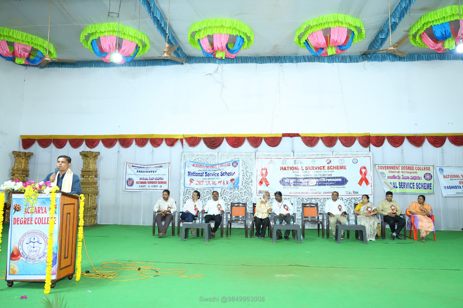 పయనించే సూర్యుడు ఏప్రిల్ 1 (సంగారెడ్డి జిల్లా జహీరాబాద్ మండలం ప్రతినిధి స్వాతి.నర్సిములు): జహీరాబాద్ పట్టణంలోని షట్కార్ ఫంక్షన్ హాల్ లోఆచార్య డిగ్రీ కళాశాల , రెడ్ రిబ్బన్ క్లబ్ మరియు ఎన్ ఎస్ ఎస్ ఆధ్వర్యంలో మంగళవారం హెచ్ఐవి పై జిల్లాస్థాయి అవగాహన సదస్సు నిర్వహించారు ఈ కార్యక్రమాన్ని ఉస్మానియా యూనివర్సిటీ ఎన్ఎస్ఎస్ కోఆర్డినేటర్ ముఖ్యఅతిథిగా హాజరై జ్యోతి వెలిగించి , జెండావిష్కరించి కార్యక్రమాన్ని ప్రారంభించారు తదనంతరం మాట్లాడుతూ హెచ్ఐవి సోకకుండా తీసుకోవాల్సిన జాగ్రత్తల గురించి , వ్యాధి సంక్రమణ జరగకుండా తీసుకోవాల్సిన జాగ్రత్తల గురించి వివరించారు అదేవిధంగా వాలంటీర్లను ఉద్దేశించి మాట్లాడుతూ గ్రామాలలో పట్టణాలలో హెచ్ఐవి పై అవగాహన కలిగించాలని యువత సాధించనిది అంటూ ఏమీ లేదని మీ వంతు కృషి చేసి సమ సమాజానికి హెచ్ఐవి పై అవగాహన కలిగించాలని ఎన్ఎస్ఎస్ వాలంటరీస్ కి తెలియజేశారు. ఈ కార్యక్రమానికి విచ్చేసిన కాకతీయ యూనివర్సిటీ రిటైర్డ్ ప్రొఫెసర్ నరసింహారావు మాట్లాడుతూ విద్యార్థులకు సమాజంపై స్పృహ కలిగి ఉండాలని తెలియజేశారు అదేవిధంగా జహీరాబాద్ ఏరియా ఆసుపత్రి ఎయిడ్స్ డైరెక్టర్ అజయ్ మాట్లాడుతూ రక్త పరీక్షలు మరియు చికిత్స సలహా సూచనల గురించి వారిని సంప్రదించాలని తెలియజేశారు ఈ కార్యక్రమాన్ని ఉద్దేశించి విద్యార్థిని విద్యార్థులు ప్రదర్శించినటువంటి నృత్య ప్రదర్శనలు మరియు స్కిట్లు ఎంతగానో ఆకట్టుకున్నాయి ఈ కార్యక్రమంలో ఆచార్య కాలేజ్ ప్రిన్సిపల్ డాక్టర్ చింతల హరికుమార్, వశిష్ట కాలేజ్ ప్రిన్సిపల్ సిద్ధారెడ్డి మరియు ప్రోగ్రాం ఆఫీసర్స్ వెంకట్రాం రెడ్డి ,నందు గౌడ్, శకుంతల, రాములు, ప్రీతి, ముజాఫర్, మారుతి రావు, అమర్నాథ్ ,దీపిక, దత్తు మరియు ఆచార్య డిగ్రీ కళాశాల అధ్యాపకులు , ఎన్ఎస్ఎస్ వాలంటరీలు పాల్గొన్నారు.
