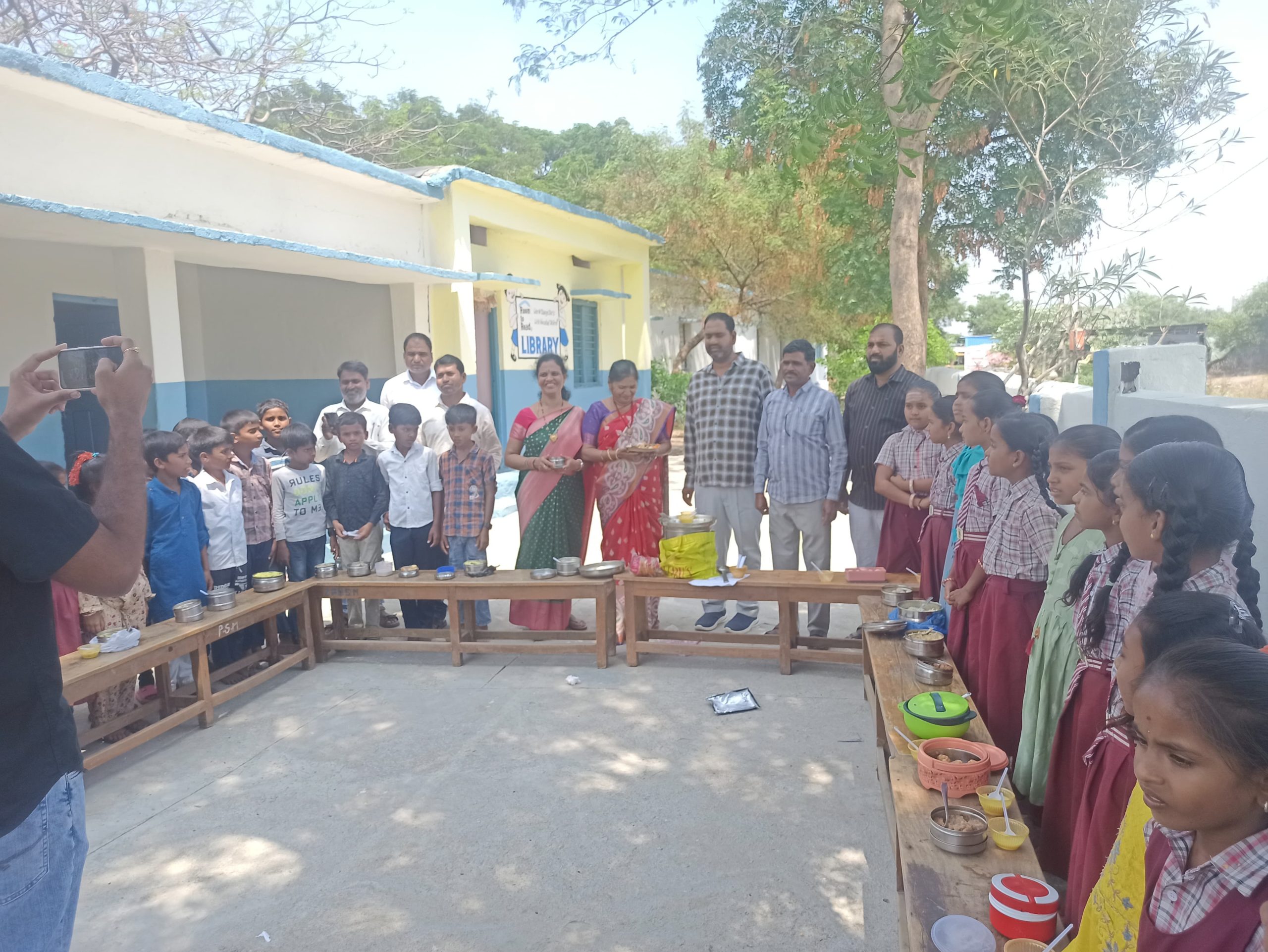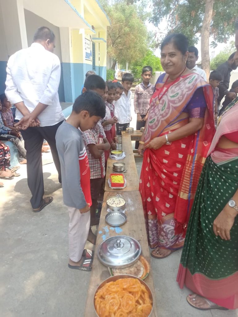 పయనించే సూర్యుడు ఏప్రిల్ 3 (వట్టిపల్లి ప్రతినిధి హనీఫ్) సంగారెడ్డి జిల్లా వట్టిపల్లి మండలం మర్వెల్లి గ్రామంలో ప్రాథమిక పాఠశాల యందు విద్యార్థులు ఈ సమాజంలో జరుగుతున్నటువంటి ఆహార పదార్థాలు స్వచ్ఛందంగా వండుకొని తింటే ఎలా ఉంటాయి హోటల్లో ఆర్డర్ చేసి తింటే ఎలా ఉంటాయి విద్యార్థులు ఎంతో చక్కగా వివరించారు మనం స్వచ్ఛందంగా వండుకొని తింటే అందులో ఉన్న ఉపయోగాల గురించి దానివల్ల వచ్చే ఆరోగ్యానికి వచ్చే ఉపయోగాల గురించి ఎంతో చక్కగా వివరించారు చిన్నారి విద్యార్థులు అందరూ తరగతుల వారిగా ఒక్కొక్కరు ఒక్కొక్క ఐటెం తయారు చేసుకొని రావడం జరిగింది. వర్షా ఐదవ తరగతి క్లాస్ బెల్లం నువ్వుల లడ్డు. జ్యోతిక బెల్లం గులాబ్ జామ్. మనిషా సేమియా, భానుప్రియ డబుల్ కా మీఠా, స్పందన పకోడీ, విశ్వేశ్వరి పల్లీలు నువ్వుల చక్కిలు, శ్రీరామ్ సత్తుపిండి లడ్డూలు, రక్షణ పునుగులు, విశ్వతేజ మామిడి పులిహోర, మునగాకు కొత్తిమీర కరివేపాకు పుదీనా తో పచ్చడి తయారు చేశారు. పాఠశాల ప్రధానోపాధ్యాయురాలు అనురాధ మేడంగారు కొబ్బరి పోలెలు పులిహోర, విద్యార్థులందరికీ జిలేబి ఇవ్వడం జరిగింది. పాఠశాల ఉపాధ్యాయులు రితిన్ రెడ్డి విద్యార్థులందరికీ ఫ్రూట్ సలాడ్ అందివ్వడం జరిగింది. ఇట్టి కార్యక్రమాన్ని తిలకించడానికి జడ్.పి.హెచ్.ఎస్ ప్రధానోపాధ్యాయురాలు సాయి లీల . రుచి చూసి విద్యార్థులను అభినందించడం జరిగింది. కార్యక్రమంలో పాఠశాల సీనియర్ ఉపాధ్యాయులు టి. రవీందర్, సిహెచ్. సంగమేశ్వర్, టీ. నర్సింలు, సీఆర్పీలు సంగమేశ్వర్, గోపి సింగ్ పాల్గొనడం జరిగింది.