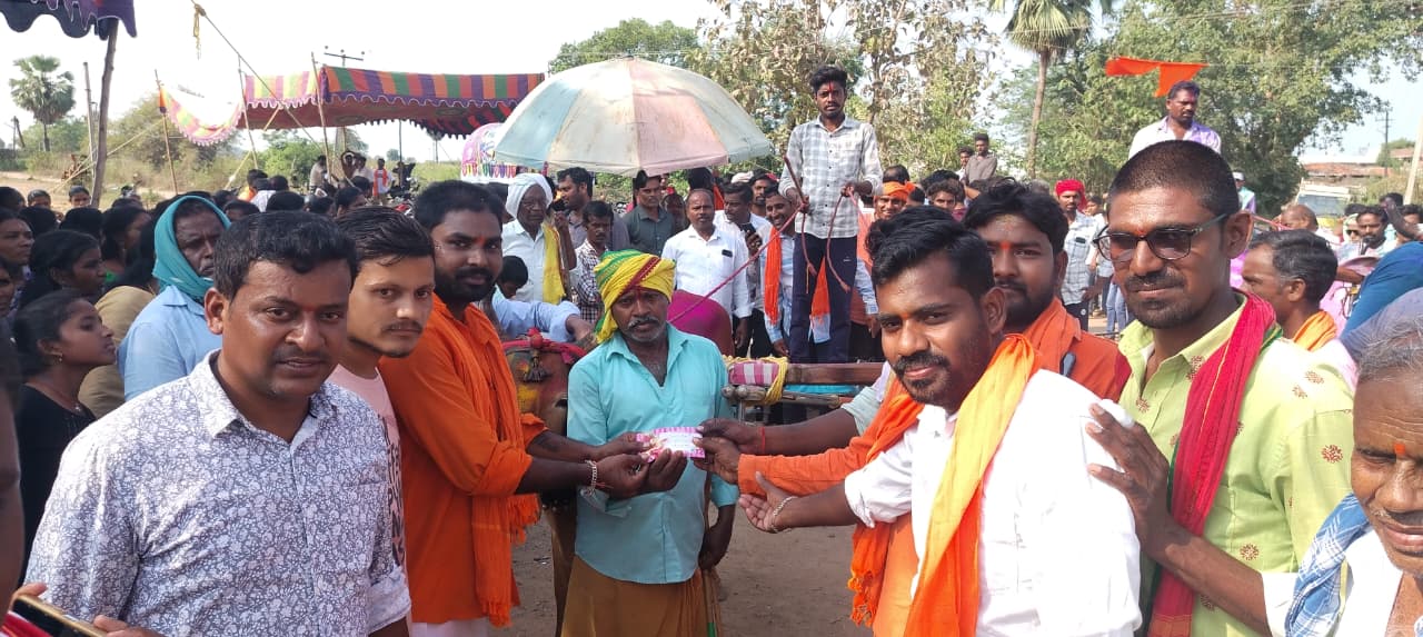 పయనించే సూర్యుడు 3-4-2026 గొల్లపల్లి మండల రిపోర్టర్ ఆవుల చందు జగిత్యాల జిల్లా గొల్లపల్లి మండల కేంద్రంలోని గోవిందు పల్లె గ్రామంలో బుధవారం హనుమాన్ జయంతి సందర్భంగా ఎడ్లబండి పోటీలు నిర్వహించడం జరిగింది ఈ పోటీలో గెలుపొందిన వారికి 1,2,3,బహుమతులు ఇవ్వడం జరిగింది. ఒకటవ బహుమతి గోవిందు పల్లె గ్రామ సర్పంచ్ మేక స్వామి 20116 రూపాయలు షేక్ అయాన్ తిరుమలాపూర్ వాస్తవ్యులకు ఇవ్వడం జరిగింది. అదేవిధంగా రెండవ బహుమతి 2007-2008, ఏడవ తరగతి క్లాస్ మెంట్స్.తిరుపతి, ఆర్ మధు, కొమురయ్య,వెంకటేష్,రేవంత్,మనోహర్,స్వామి, మణిరత్నం, మహేష్, రెండవ బహుమతి 15116 గుండు మల్లన్న శకల్ల వాస్తవ్యులకు లు ఇవ్వడం జరిగింది.అదే విధంగా మూడవ బహుమతి కోట అశోక్ గోవిందు పల్లె ఉపసర్పంచ్ మూడవ బహుమతి10116 గుడ్ల మేధానష్ వెనుగుమట్ల వాస్తవ్యులకు ఇవ్వడం జరిగింది.ఈ కార్యక్రమంలో గోవింద పల్లె గ్రామ ప్రజలు మరియు ప్రజా ప్రతినిధులు మరియు తదితరులు పాల్గొన్నారు.