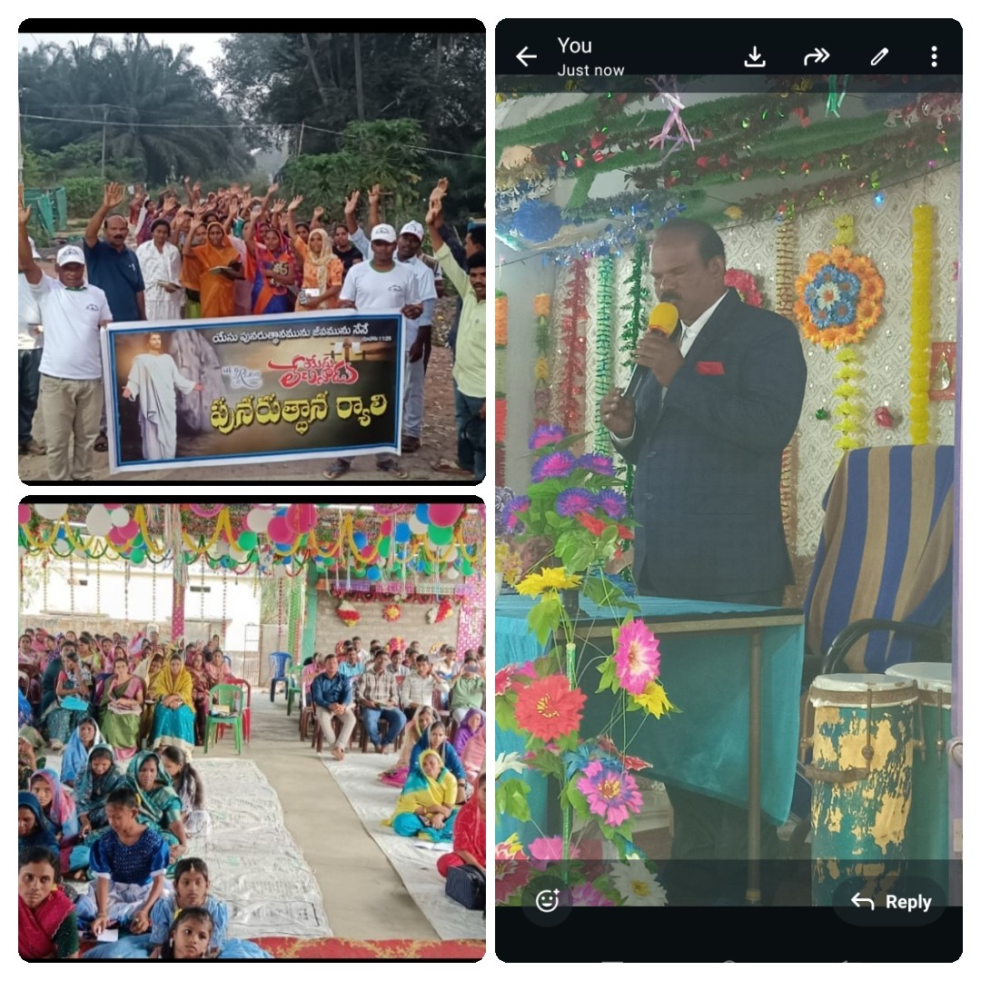 పయనించే సూర్యుడు న్యూస్ ఏప్రిల్ 6 అశ్వారావుపేట మండల రిపోర్టర్ భద్రాద్రి కొత్తగూడెం జిల్లా ఏసుక్రీస్తు మూడవ దినమున మరణం గెలిచి లేచారని దీనిని ఈస్టర్ పండగగా జరుపుకుంటారని ఫాస్టర్ సున్నం సియోనుకుమార్ అన్నారు. ఈ సందర్భంగా దిబ్బగూడెం అల్లిగూడెం రామన్నగూడెం నాగుల గుంపు చర్చిలలో ఆదివారం ఆయన మాట్లాడుతూ ఏసుక్రీస్తు మానవాళి పాల విమోచన కొరకు తన సిలువపై తన పరిశుద్ధయ రక్తం కార్చి చనిపోయిన తాను ముందుగా చెప్పినట్లు మరణం గెలిచి లేచాడని క్రైస్తవులు ఈస్టర్ పండుగ జరుపు కుంటున్నారు. అలాగే ఏసుక్రీస్తు మరణం గెలిచి తిరిగి లేవడం ఆయన పరిశుద్ధుడు అని ఆయన ద్వారా మాత్రమే మానవాళికి పాప విమోచన దొరుకుతుంది అన్నారు. ఈ కార్యక్రమంలో చర్చి పాస్టర్ సియోను కుమార్ రాందాస్ జైపాల్, ప్రసాద్ దేవేంద్ర ప్రభుదాస్, కిషోర్ సుధాకర్ రమేష్ ఏసుసేపు మలాకి డేవిడ్ రాజు కుమారి క్రైస్తవ సోదరులు సంఘస్తులు తదితరులు పాల్గొన్నారు.