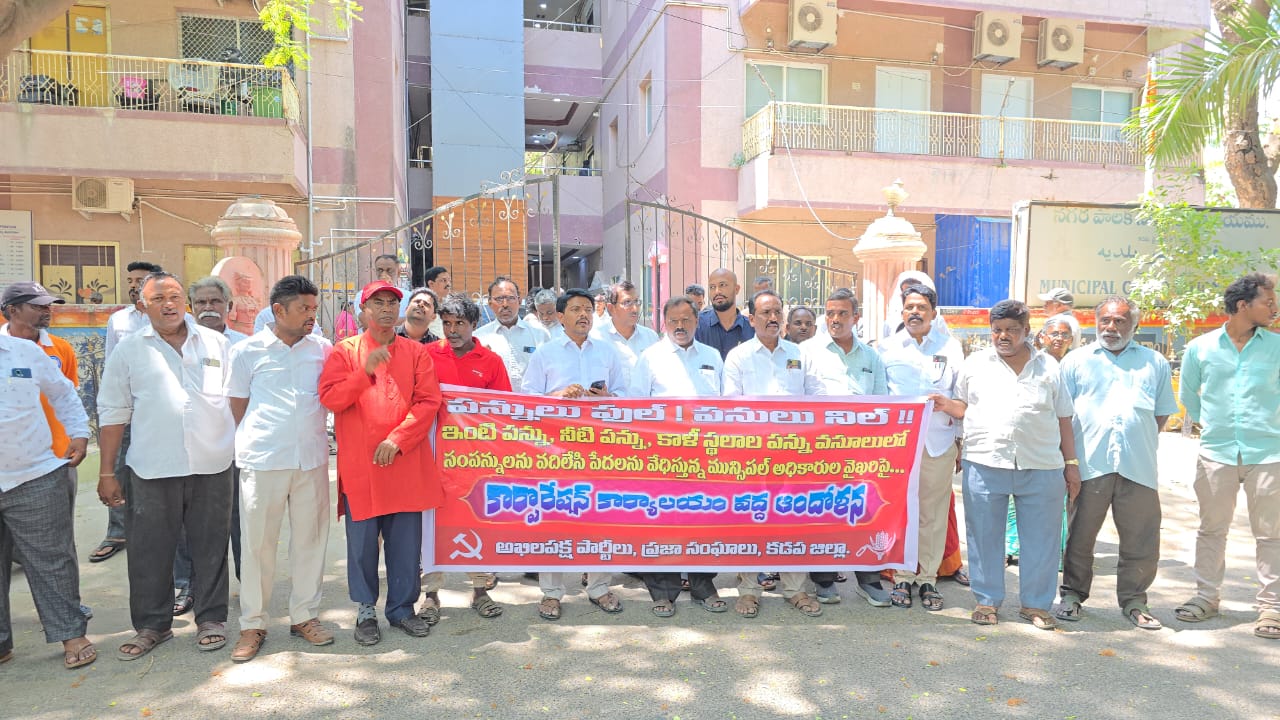 పయనించే సూర్యుడు న్యూస్: కడప ఏప్రిల్: 8 పన్ను వసూలులో లక్షల బకాయిలు ఉన్న సంపన్నులను వదిలేసి సామాన్యులను పీడిస్తున్న మున్సిపల్ / కార్పొరేషన్ అధికారుల వైఖరిని నిరసిస్తూ అఖిలపక్ష పార్టీ ప్రజాసంఘాలు తలపెట్టిన జిల్లా వ్యాప్త ఆందోళనలో భాగంగా మంగళవారం స్థానిక కడప కార్పొరేషన్ వద్ద ఆందోళన నిర్వహించారు. ఈ సందర్భంగా మాజీ మేయర్ పాకా సురేష్, సిపిఐ జిల్లా కార్యదర్శి గాలి చంద్ర, సిపిఎం నగర కార్యదర్శి రామ్మోహన్ రెడ్డి, కాంగ్రెస్ అలీ ఖాన్, జేవి రమణ, సంగటి మనోహర్, దస్తగిరి, ఎస్కే మైనుద్దీన్, అమీన్ పీర్, మాజీ కార్పొరేటర్ లు సమ్మెట బసవరాజు, షఫీ, అజమతుల్లా , రామకృష్ణారెడ్డి, సుబ్బరాయుడు, రామచంద్రయ్య తదితరులు మాట్లాడుతూ స్థానిక సంస్థలు స్వయం పరిపాలన దిశగా నిధులు, విధులు చట్టబద్ధత కల్పిస్తూ రాజ్యాంగం ఇచ్చిన హక్కును అధికారులు అధికార పార్టీ నేతలు ఉల్లంఘిస్తున్నారని వారు ఆరోపించారు. జిల్లాలో ఇంటి పన్ను నీటి పన్ను ఖాళీ స్థలాల పన్ను వసూలులో లక్షల బకాయిలు ఉన్న సంపన్న వర్గాల జోలికి పోకుండా సామాన్యులను పీడించి కుళాయి కనెక్షన్ కట్ చేస్తామంటూ, ఇంటికి తాళాలు వేస్తామంటూ ఫైనాన్స్ కంపెనీల కంటే అద్వానంగా వ్యాపార సంస్థలను తలదన్నే విధంగా మున్సిపల్ అధికారులు వ్యవహరించారన్నారు. ఇంత ఒత్తిడి చేసి వసువులైన జనరల్ ఫండ్ ను తిరిగి జనం కోసం మౌలిక సదుపాయాలైన రోడ్లు కాలువలు వీధిలైట్లు త్రాగునీటి వసతి కల్పనకు ఖర్చు చేయడంలో శ్రద్ధ పెట్టడం లేదన్నారు. మురికివాడల్లో మౌలిక సమస్యలతో వేసవి ఆరంభంలోనే గుక్కెడు మంచినీటి కోసం కటకటా అనాల్సి వస్తుందన్నారు. చిన్నపాటి వర్షాలకే బయటికి పోయే మార్గాలు లేక మురికి కూపాలుగా మారి, దోమలకు నిలయాలై చికెన్ గున్యా డెంగ్యూ మలేరియా లాంటి విష జ్వరాల బారినబడి ఆసుపత్రుల చుట్టూ తిరిగి అప్పులపలై ఉన్న ఇంటిని కూడా అమ్ముకునే దుస్థితి నెలకొన్నది అన్నారు. గత పాలకవర్గంలో 15 ఫైనాన్స్ నిధులను ఖర్చు చేసేందుకు తీర్మానం చేసి, టెండర్లు పిలిచి పనులు ప్రారంభించాల్సిన సమయంలో అధికార పార్టీ నేతల జోక్యంతో టెండర్లను రద్దు చేసిన చరిత్ర కడప కార్పొరేషన్ కి దక్కుతుందన్నారు. జనం నుండి వసూలు చేసిన జనరల్ ఫండ్ ను జనావాసాల్లో కాకుండా సంపన్న వర్గాల ఆర్థిక ప్రయోజనాల కోసం వెంచర్లలో ఖర్చు చేస్తున్నారని వారు ఆరోపించారు. లక్షల నుండి కోట్లలో బకాయిలు ఉన్న సంపన్నుల జోలికి ఎందుకు పోవడం లేదని నగరపాలక సంస్థ అధికారులు నిలదీశారు. ప్రభుత్వ రంగ సంస్థలైన రెవిన్యూ, పోలీస్, ఆర్ అండ్ బి, రైల్వే, ఆర్టీసీ, ఎలక్ట్రిసిటీ లాంటి సంస్థలు లక్షల బకాయిలు పేరుకుపోయినప్పటికీ వసూలులో ఎందుకు జాబ్ ఏం చేస్తున్నారని వారు నిలదీశారు. ప్రభుత్వం నుండి బిపిఎస్, మ్యుటేషన్, అమృత్, స్ట