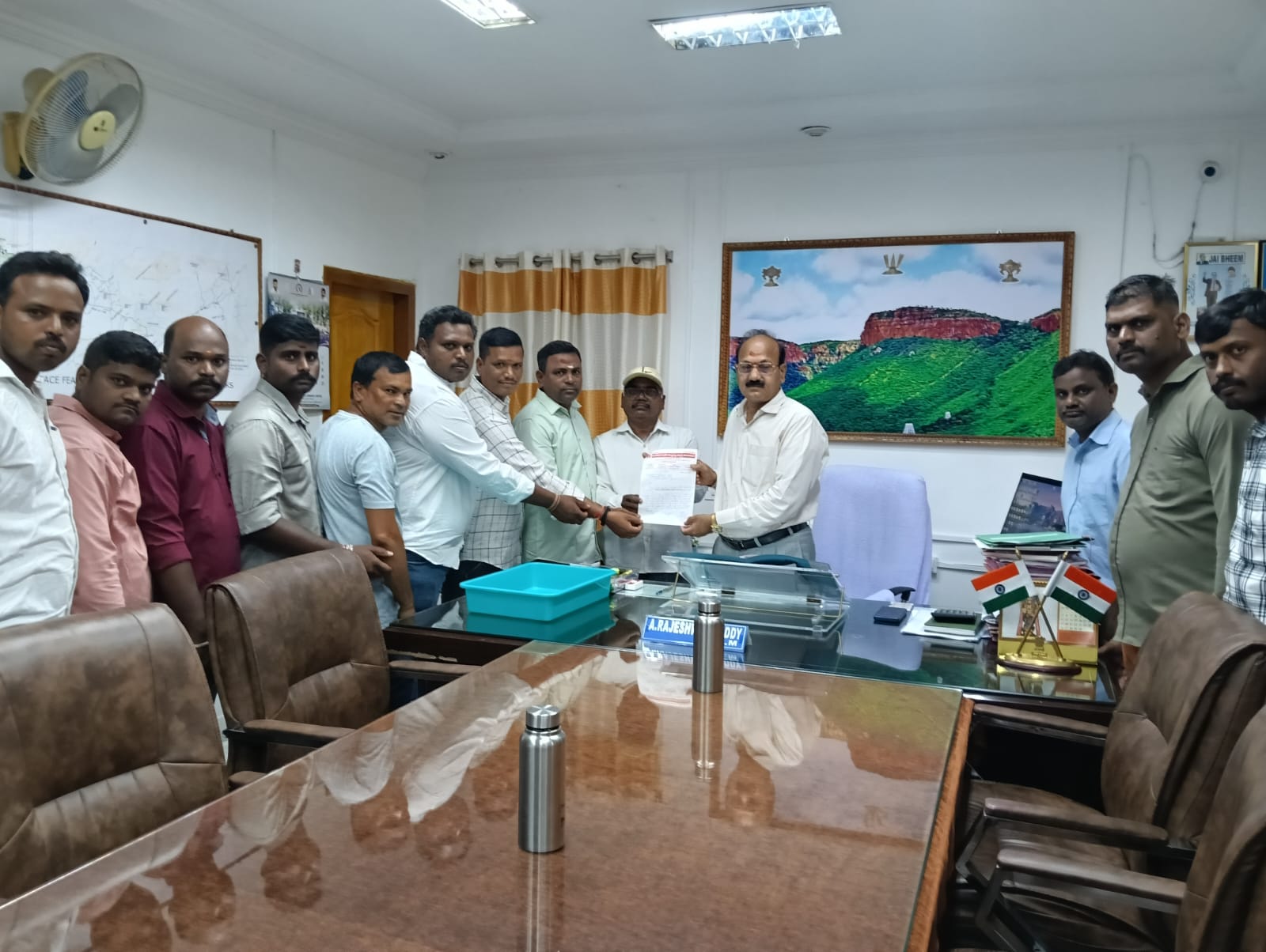 పయనించే సూర్యుడు న్యూస్: పెద్దపల్లి,సెంటినరీ కాలనీ-11 సింగరేణి భూపాలపల్లి ఏరియాలో సాయిరాం సెక్యూరిటీ కాంట్రాక్ట్ కార్మికులను ఎలాంటి నిబంధనలు లేకుండా తిరిగి అందరిని డ్యూటీలోకి తీసుకోవాలని జిఎం రాజేశ్వర్ రెడ్డి కి సింగరేణి కాలరీస్ కాంట్రాక్ట్ వర్కర్స్ యూనియన్ ఐఎఫ్టియు రాష్ట్ర ప్రధాన కార్యదర్శి ఏ వెంకన్న కార్మికులతో వెళ్లి వినతిపత్రం అందించారు. కార్మికులు ఎదుర్కొంటున్న సమస్యల విషయాన్ని జిఎం కు వివరించగా కొంత టైం పడుతుందని అప్పటివరకు ఓపికగా ఉండాలన్నారని వెంకన్న తెలిపారు