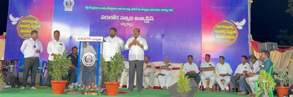పయనించే సూర్యుడు రిపోర్టర్ జగయ్యపేట నియోజకవర్గం ఇన్చార్జి చేని రాంబాబు ఎన్టీఆర్ జిల్లా జగ్గయ్యపేట నియోజకవర్గం ఏప్రిల్ 13 జగ్గయ్యపేట మండలం చిల్లకల్లు గ్రామంలో యాక్సిస్ బ్యాంక్ ఎదురుగా గాలం నాగేశ్వరావు స్థలం నందు పరలోక సన్నిధి మినిస్ట్రీస్ వారి ఆధ్వర్యంలో ఏర్పాటు చేసిన పరిశుద్ధాత్మ సువార్త మహాసభలు కార్యక్రమంలో పాల్గొన్న జగ్గయ్యపేట నియోజకవర్గ వైఎస్ఆర్ సీపీ ఇన్-ఛార్జ్ తన్నీరు నాగేశ్వరరావు ఈ సందర్భంగా మాట్లాడుతూ యేసు ప్రభువు ప్రేమ, శాంతి, క్షమ, దయ అనే విలువలను మానవాళికి అందించిన గొప్ప ఆధ్యాత్మిక గురువుగా గుర్తింపబడ్డారు. ఆయన బోధనలు సర్వ మానవాళికి మార్గదర్శకంగా నిలుస్తున్నాయి యేసు ప్రభువు తన జీవితమంతా దేవుని రాజ్యాన్ని ప్రకటిస్తూ పేదలపై బలహీనులపై, బాధితులపై అపారమైన ప్రేమను చూపించారు ఈ కార్యక్రమంలో రాష్ట్ర రైతు విభాగ కార్యదర్శి నంబూరి రవి, జిల్లా కార్యదర్శి మాతంగి నాగబాబు, జిల్లా ఎస్సీ సెల్ కార్యదర్శి గొర్రెపాటి బుల్లయ్య, నియోజకవర్గ ఐటీ విభాగ అధ్యక్షులు బండి రంజిత్, మాజీ ఎంపీటీసీ సభ్యులు దొంగల జానకి రామయ్య, మాజీ మార్కెట్ యార్డ్ డైరెక్టర్ మన్నే అప్పారావు తదితరులు పాల్గొన్నారు