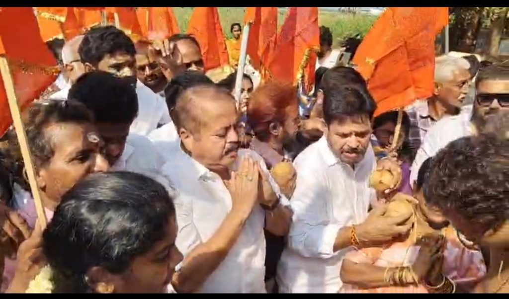 పయనించే సూర్యుడు ఏప్రిల్ 14, కాకినాడ జిల్లా కాకినాడ రూరల్ (బి వి బి) విజయనగరం నెలమమర్ల గ్రామంలో వైసిపి పాలన లో ధ్వంసం చేసిన శ్రీ రాముల విగ్రహాల ఊరేగింపు కాకినాడ రూరల్ తిమ్మాపురం గ్రామం జనసేన పార్టీ కార్యాలయం వద్ద రూరల్ శాసనసభ్యులు పంతం నానాజీ ఎమ్మెల్సీ పెరబత్తుల రాజశేఖర్, కూటమి నాయకులు స్వాగతం పలికి పూజలు నిర్వహించారు. ఈ సందర్భంగా ఎమ్మెల్యే మాట్లాడుతూ గత ప్రభుత్వ పాలన లో ఆలయాలపై దాడులు విగ్రహాల ధ్వంసం ఘటనలు ఎన్నో చోటుచేసుకున్నాయి. నెలిమర్ల లో జరిగిన ఘటన లో ధ్వంసం అయ్యిన సీత సమేత శ్రీ రాములు, లక్ష్మణ, ఆంజనేయ విగ్రహాలు ప్రతి గ్రామం మీదుగా కొట్టిపల్లి వద్ద గోదావరి లో నిమజ్జనం చేస్తారని, రూరల్ నియోజకవర్గం లో విగ్రహాల కు స్వాగతం పలికా మన్నారు. హిందూ ధర్మాన్ని పరిరక్షించే విధంగ కూటమి ప్రభుత్వ పాలనలో ఆలయాల పరిరక్షణ కు పెద్ద పీట వేస్తుందన్నారు. ఈ సందర్భంగా మాదారపు తాతాజీ మాట్లాడారు. బిజెపి నాయకులు రంబాల వెంకటేశ్వరరావు, కూటమి నాయకులు పెంకే శ్రీనివాస బాబా, కాకరపల్లి చలపతిరావు, తాతాజీ యూత్ సభ్యులు పాల్గొన్నారు.