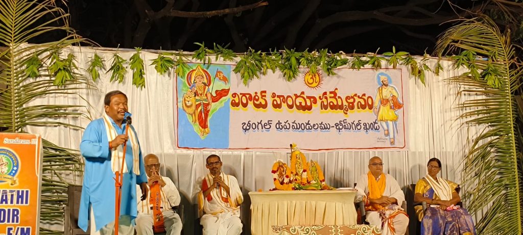 పయనించే సూర్యుడు 20 ఏప్రిల్ 2026, భీంగల్ మండల్ ప్రతినిధి కొత్వాల్ లింబాద్రి, నిజామాబాద్ జిల్లా బాల్కొండ నియోజకవర్గం భీంగల్ పట్టణంలో శనివారం రోజున రాష్ట్రీయ స్వయంసేవక్ సంఘ్ ఆధ్వర్యంలో విరాట్ హిందు సమ్మేళనం నిర్వహించడం జరిగింది. భీంగల్ మండలంలోని పలు గ్రామాల నుండి అధిక సంఖ్యలో హిందువులు భారీ ఎత్తున ఈ సమ్మేళనంలో పాల్గొన్నారు. ఇందూర్ జిల్లా రాష్ట్రీయ స్వయంసేవక్ సంఘ్ ప్రచారక్ శివ ఈ కార్యక్రమానికి ప్రధాన వక్తగా తన అమూల్యమైన సందేశంతో హిందూ ప్రజలని ఉత్తేజితం చేశాడు. భీంగల్ పట్టణ వేద పండితులు నంబి పార్థసారథి మరియు నంబి వాసుదేవా చార్యులు ఈ కార్యక్రమంలో పాల్గొని శ్రీ సీతారామ కళ్యాణం ఘనంగా నిర్వహించారు. ఈ కార్యక్రమంలో అతిథులుగా డాక్టర్ బసంత్ రెడ్డి మరియు నీలవేణి పాల్గొన్నారు. హిందూ సమాజంపై మరియు భారతదేశ పై జరిగే దాడులను ప్రతి ఒక్కరికి అర్థమయ్యే విధంగా వారు ప్రసంగించారు. ఈ కార్యక్రమం అనంతరం వచ్చిన హిందూ బంధువులందరికీ ప్రసాద వితరణ చేశారు. ఈ కార్యక్రమంలో రాష్ట్రీయ స్వయంసేవక్ స్వయం సేవకులు, సర్వసమాజ్ కమిటీ సభ్యులు, మున్సిపల్ కౌన్సిలర్లు, భీంగల్ యోగ మిత్ర బృందం, విహెచ్పి మరియు బజరంగ్దళ్, గో సేవ కమిటీ సభ్యులు మరియు భీంగల్ మండల ప్రజలు పాల్గొన్నారు.